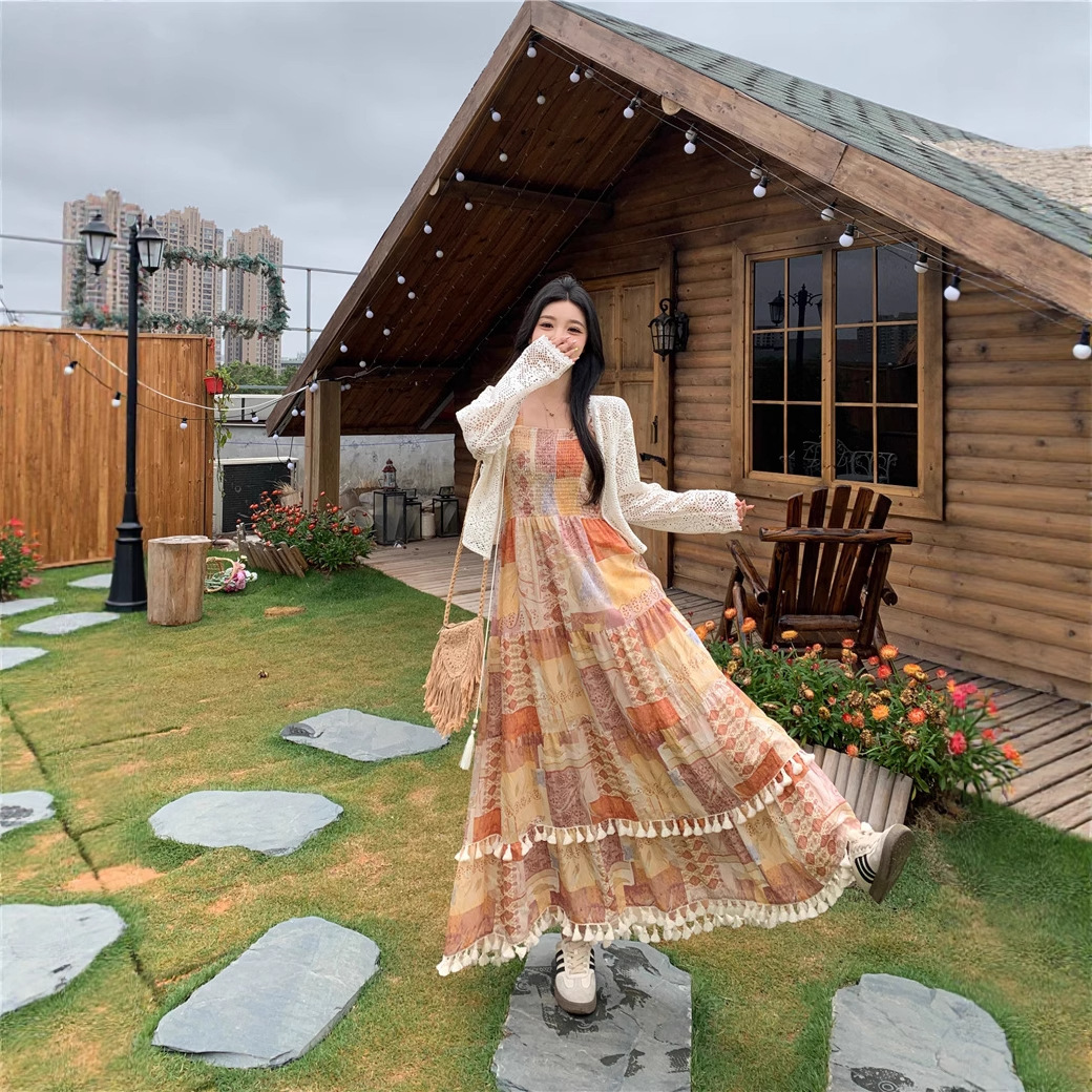 大きいサイズのレトロな海辺の休暇のボヘミアン風のフリンジサスペンダースカートの透かし彫りのカーディガンの肉隠れセットの女性の夏