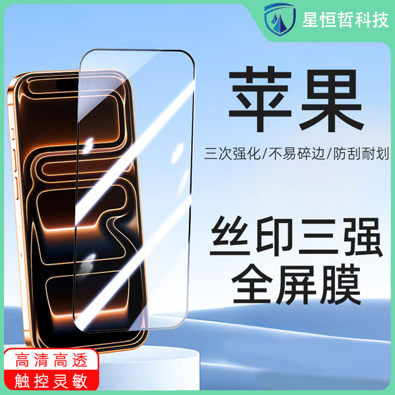 适用苹果17丝印二强钢化膜16手机膜17pro三强15全屏高清14钢化膜