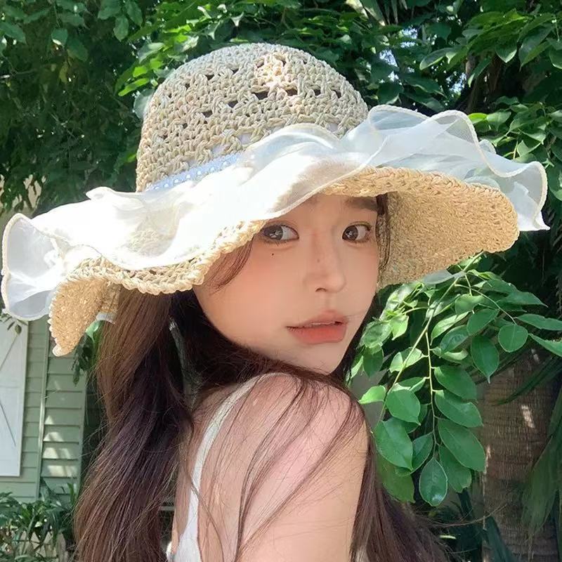 大きなつばの女性用レース麦わら日よけ帽子、夏用通気性麦わら帽子、海辺のフルフェイスUV保護日よけ帽子