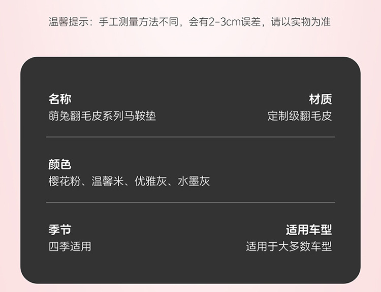 颜色 温馨米(无靠背主副驾驶垫),樱花粉(无靠背主副驾驶垫),浅灰(无靠背主副驾驶垫),深灰(无靠背主副驾驶垫),【一体单靠背】温馨米,【一体单靠背】樱花粉,【一体单靠背】浅灰,【一体单靠背】深灰,【分体单靠背】温馨米,【分体单靠背】樱花粉,【分体单靠背】浅灰,【分体单靠背】深灰,【一体前排主副套装】温馨米,【一体前排主副套装】樱花粉,【一体前排主副套装】浅灰,【一体前排主副套装】深灰,【分体前排主副套装】温馨米,【分体前排主副套装】樱花粉,【分体前排主副套装】深灰,【分体前排主副套装】浅灰,温馨米【后排套装】,樱花粉【后排套装】,深灰【后排套装】,浅灰【后套套装】,【无靠背后排长垫】温馨米,【无靠背后排长垫】樱花粉,【无靠背后排长垫】浅灰,【无靠背后排长垫】深灰,温馨米【后排靠背】,樱花粉【后排靠背】,浅灰【后排靠背】,深灰【后排靠背】,温馨米全车五座【常规座椅】,樱花粉全车五座【常规座椅】,浅灰全车五座【常规座椅】,深灰全车五座【常规座椅】,【一体式运动座椅五座】温馨米,【一体式运动座椅五座】樱花粉,【一体式运动座椅五座】浅灰,【一体式运动座椅五座】深灰,温馨米【无靠背三件套】,樱花粉【无靠背三件套】,浅灰【无靠背三件套】,深灰【无靠背三件套】