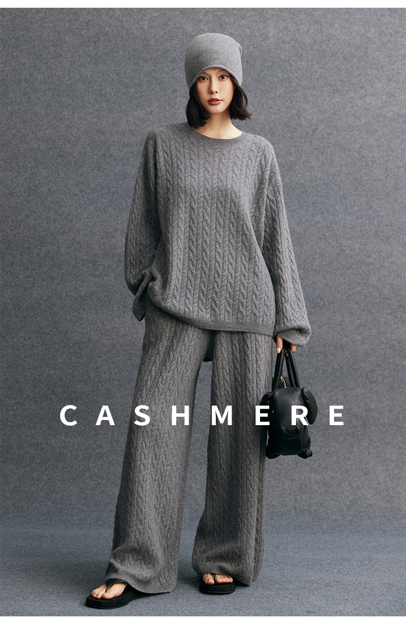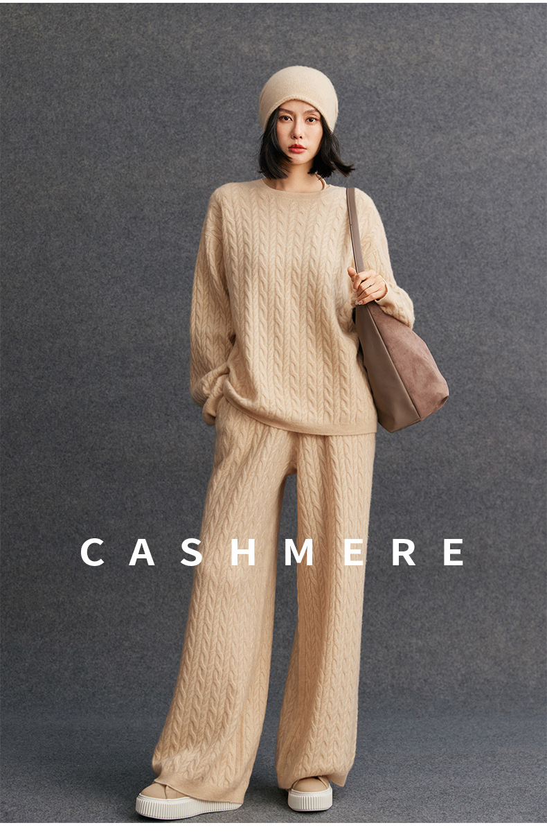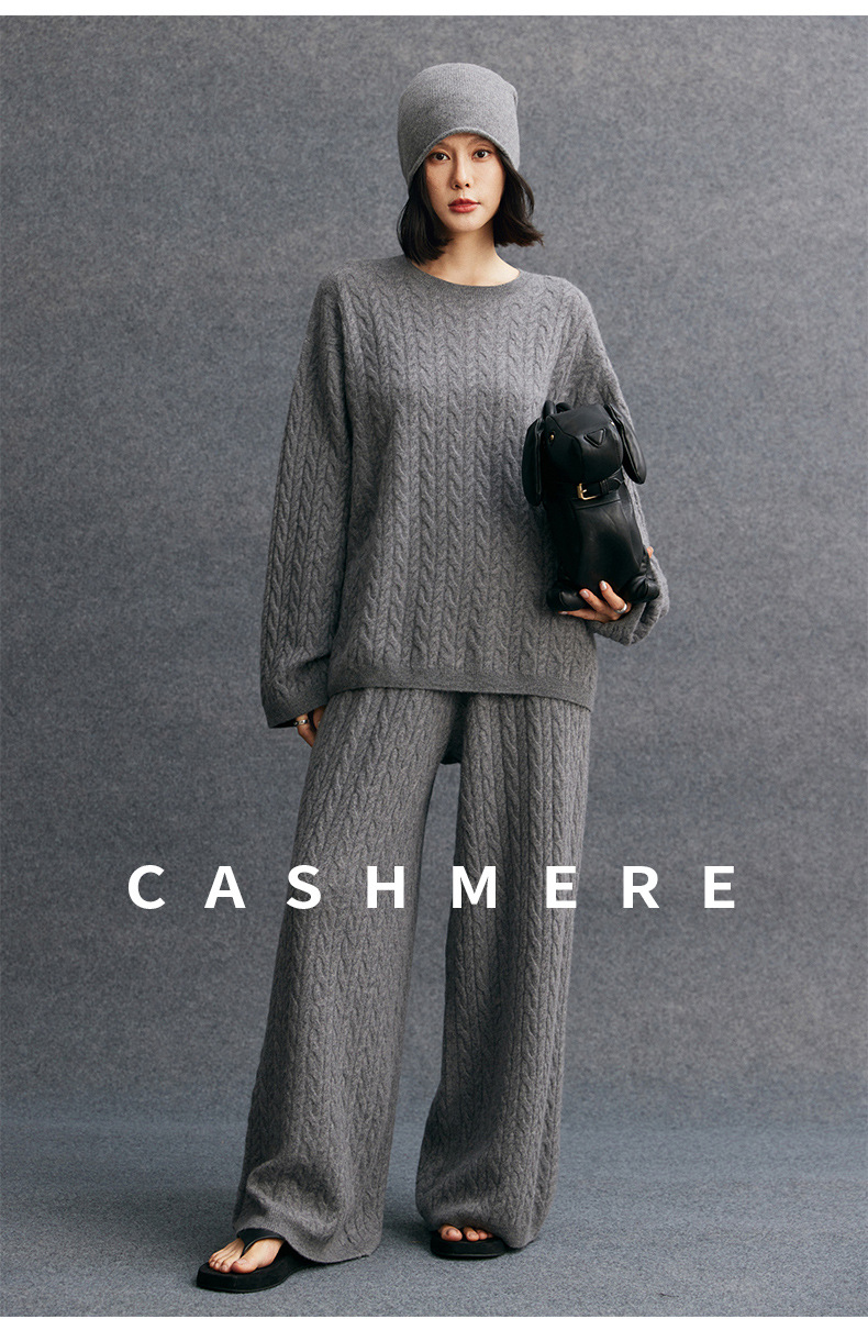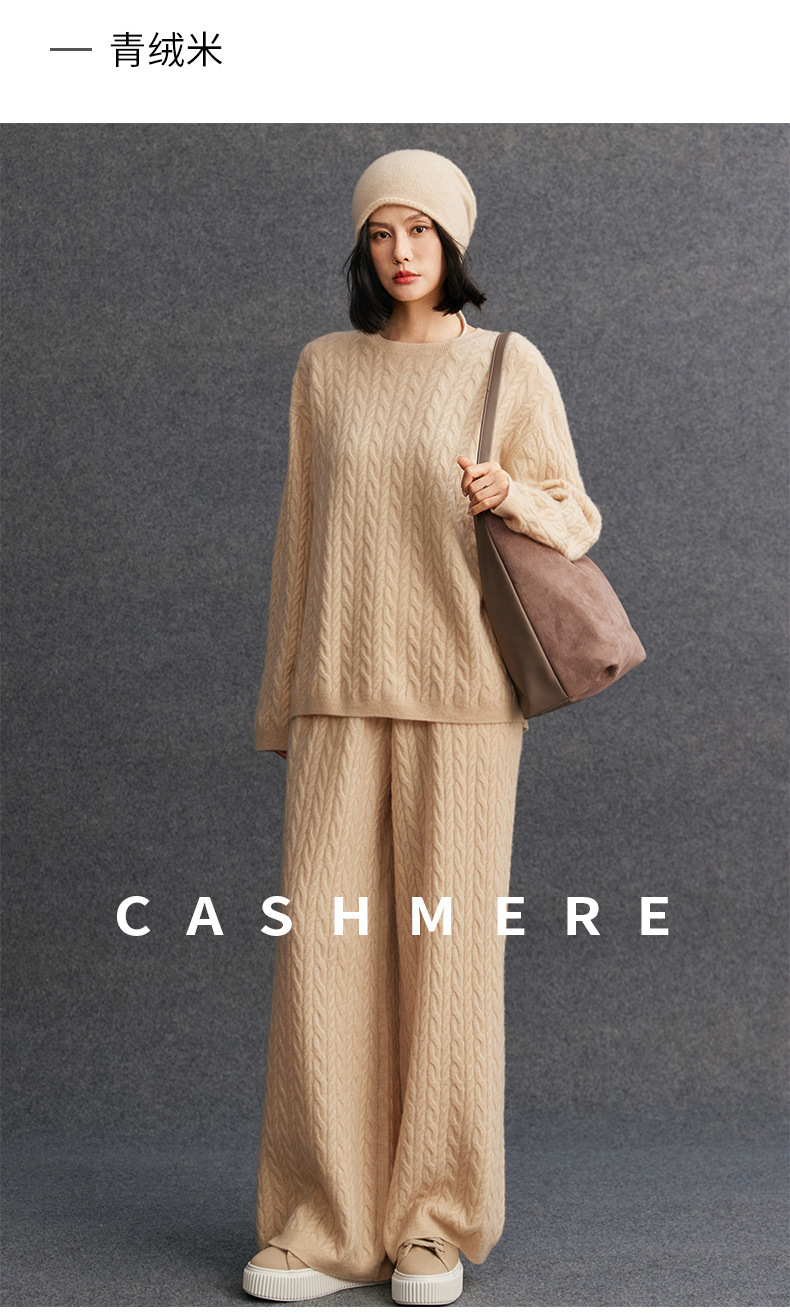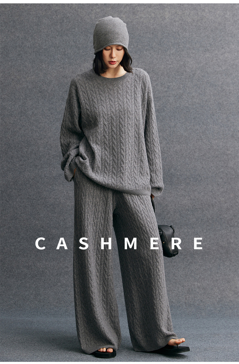 山羊绒女士绞花纯色宽松简约百搭阔腿裤秋冬新款复古老钱风休闲裤