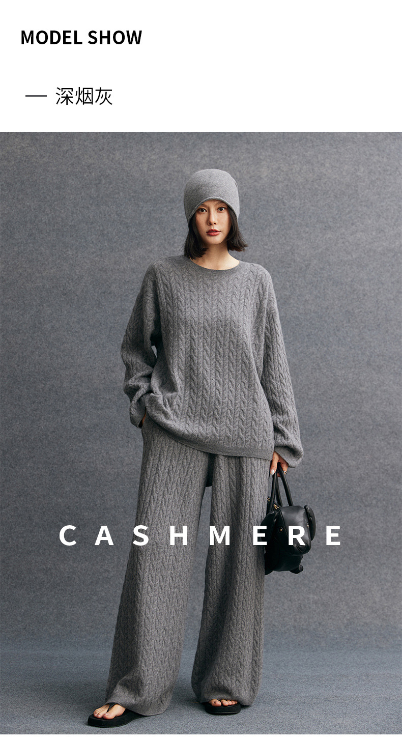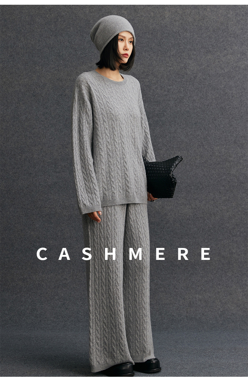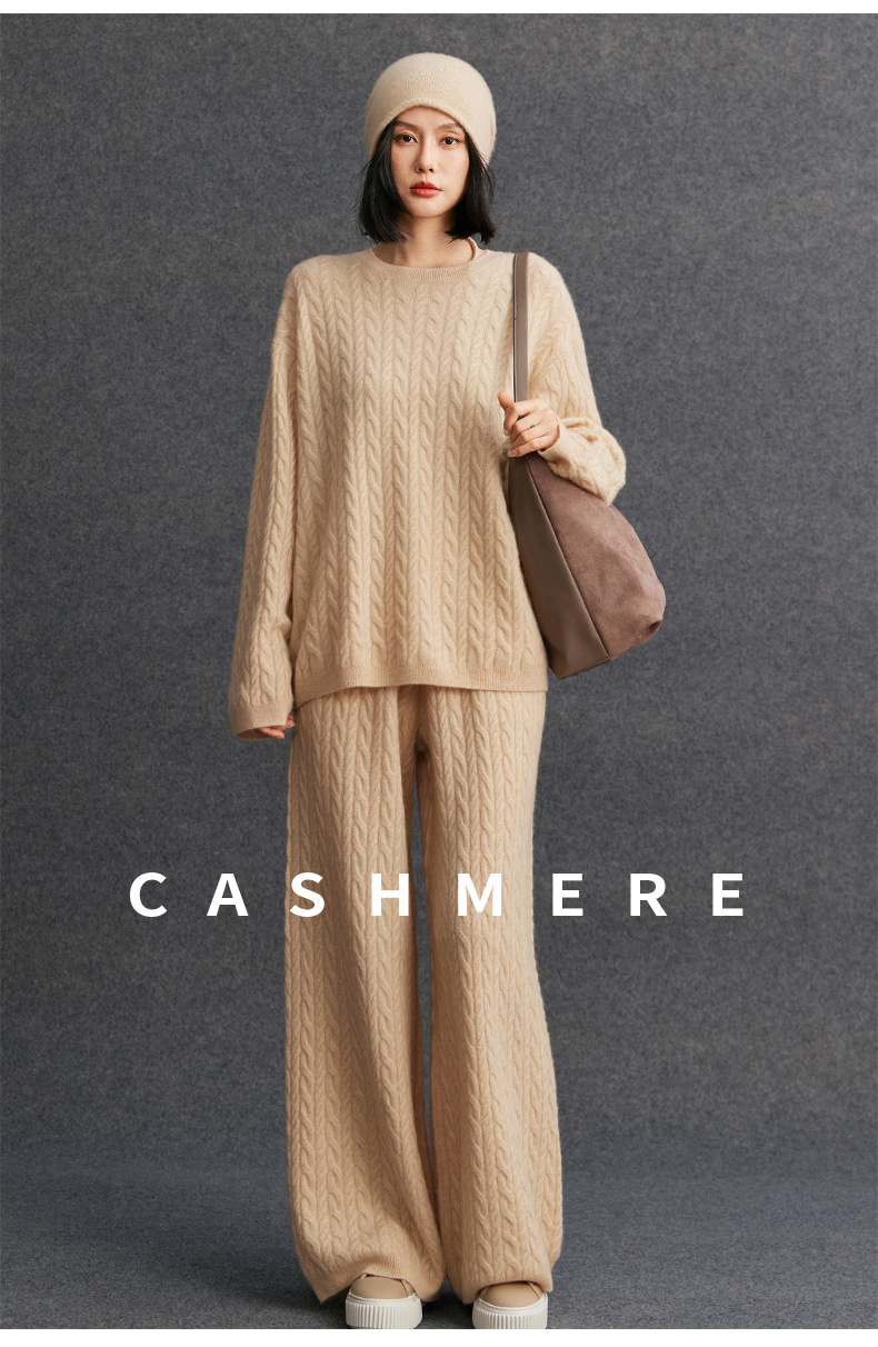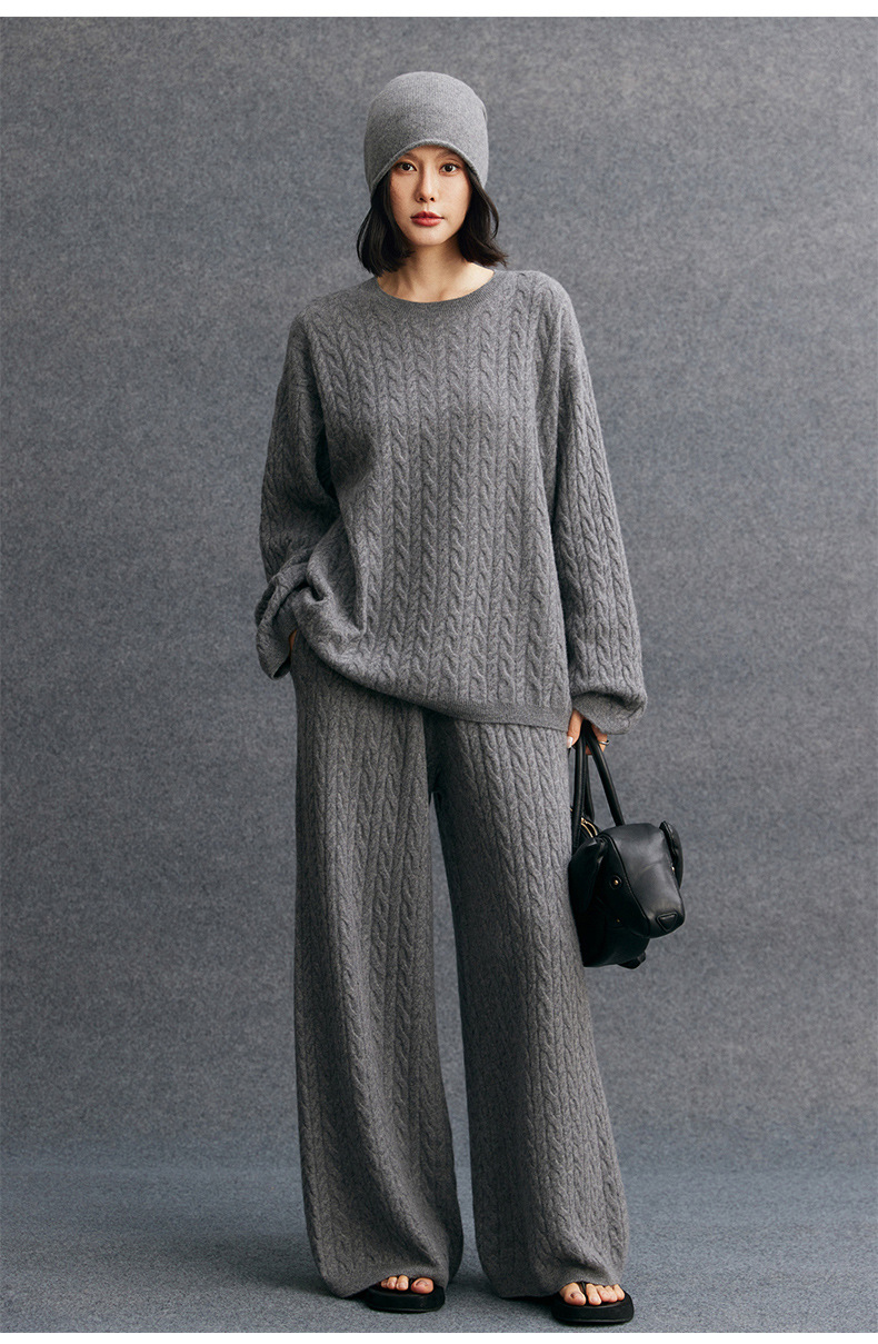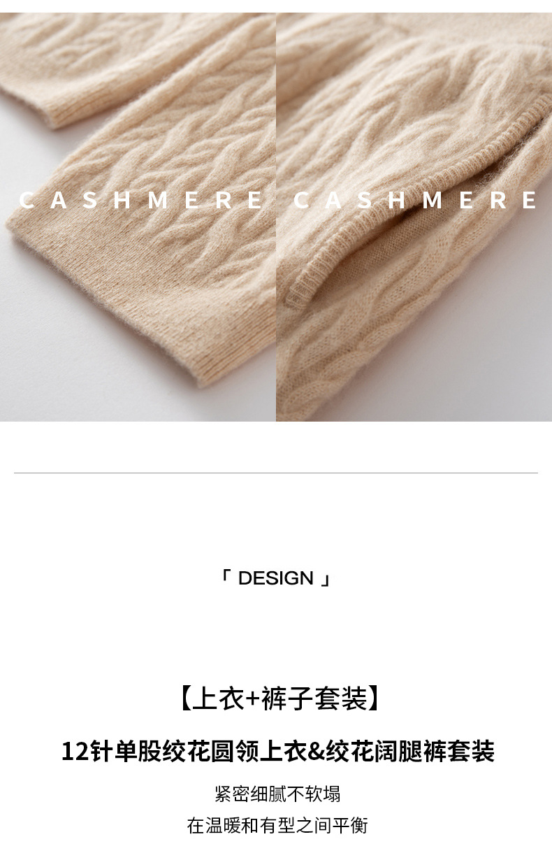 山羊绒女士绞花纯色宽松简约百搭阔腿裤秋冬新款复古老钱风休闲裤