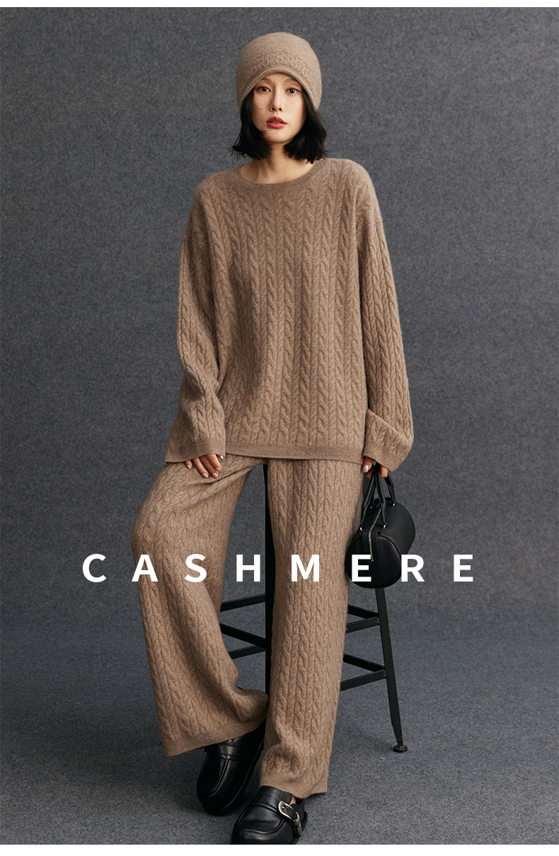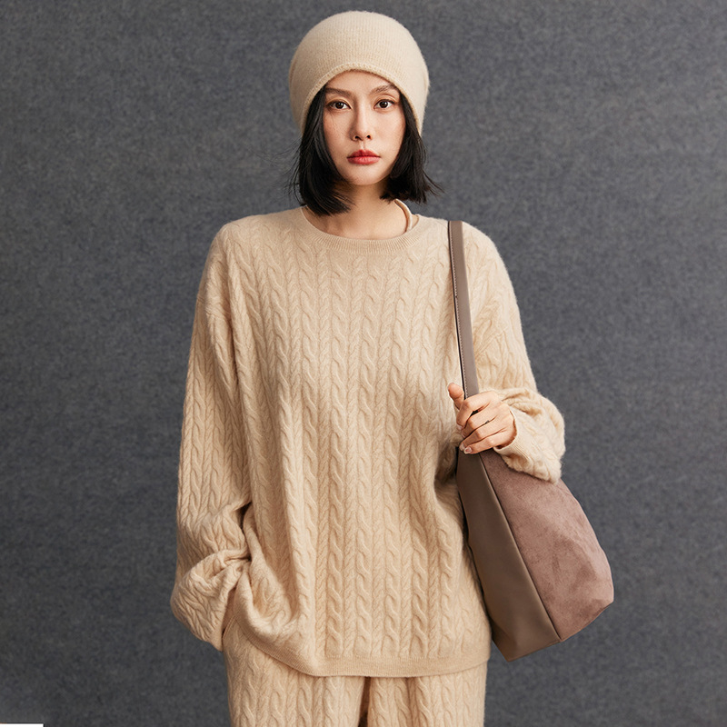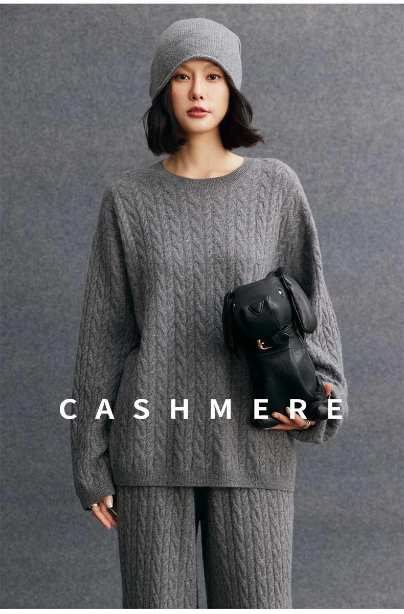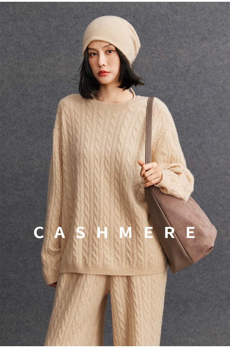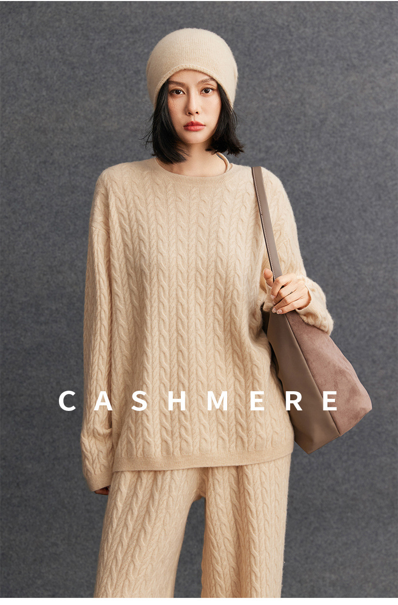 山羊绒女士圆领麻花宽松休闲简约百搭羊绒衫秋冬新款慵懒风针织衫