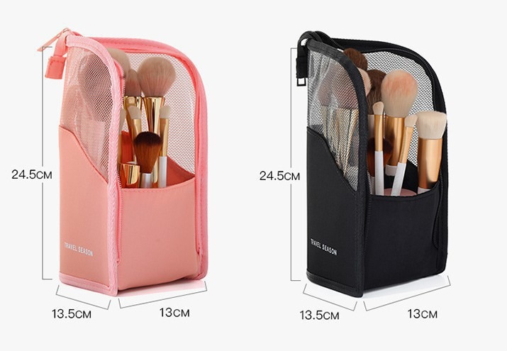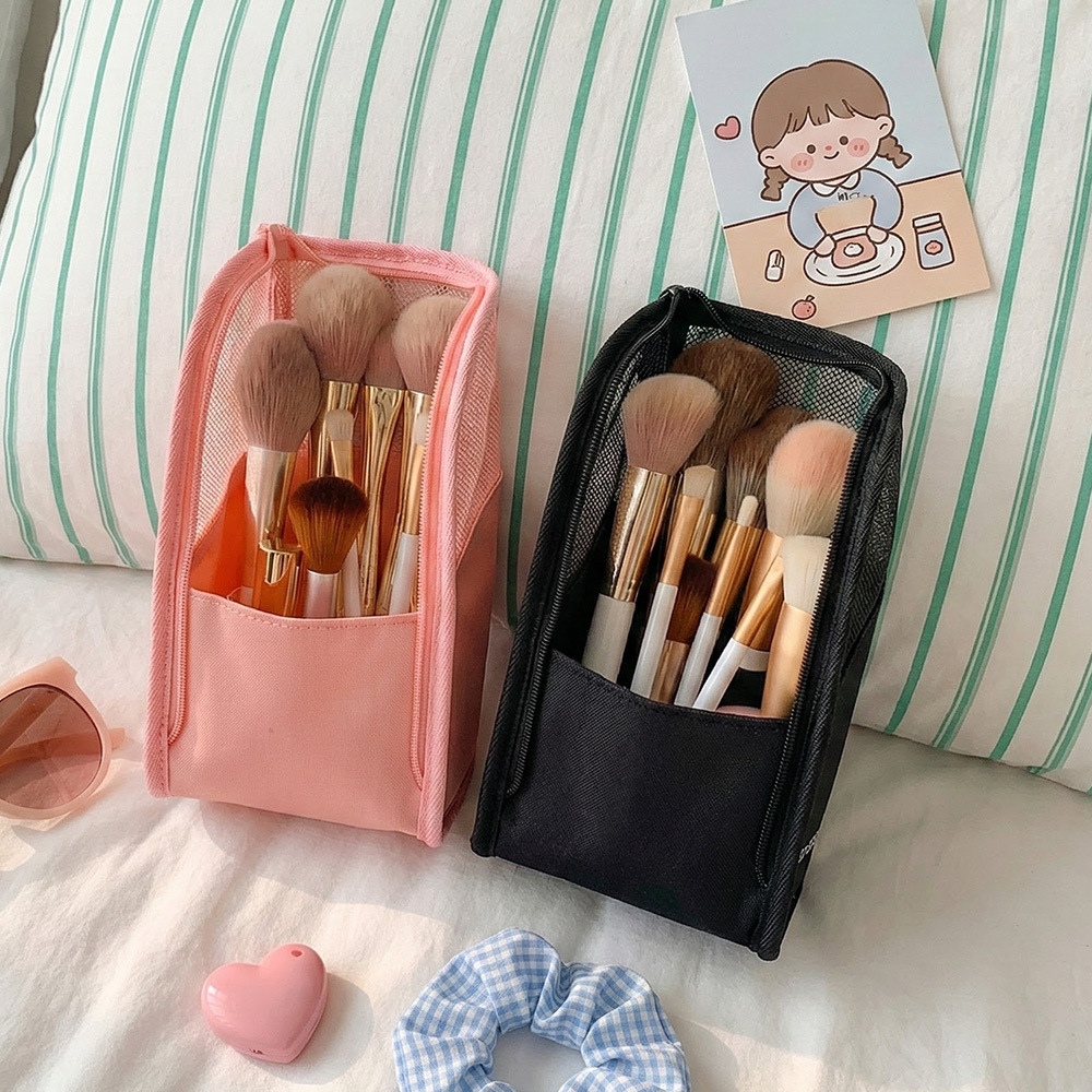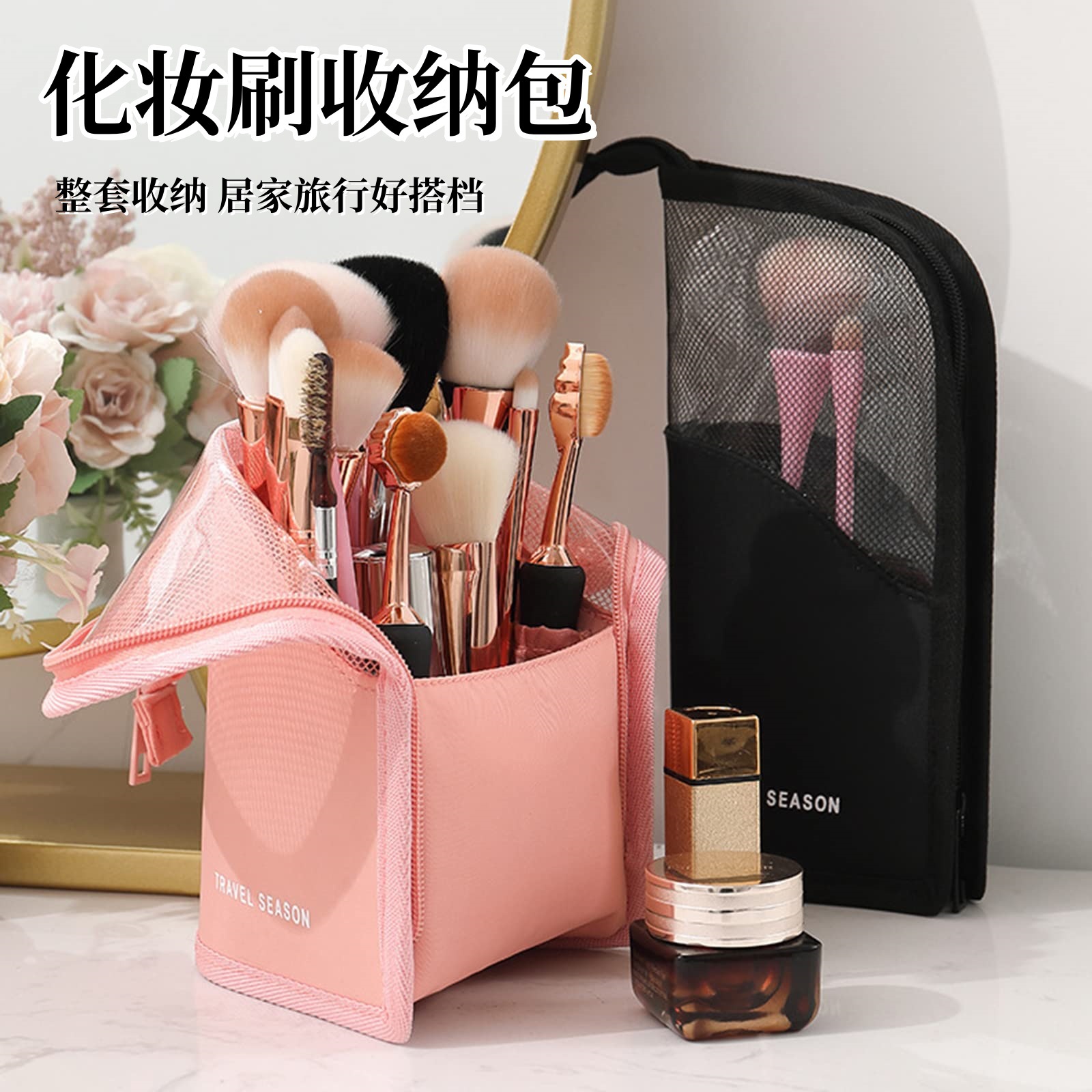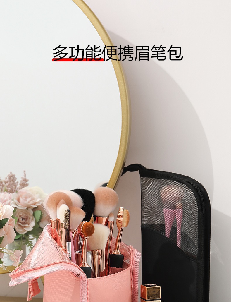 INS化妆刷收纳包立式口红眉笔盒便携网纱半透明多功能手提收纳袋