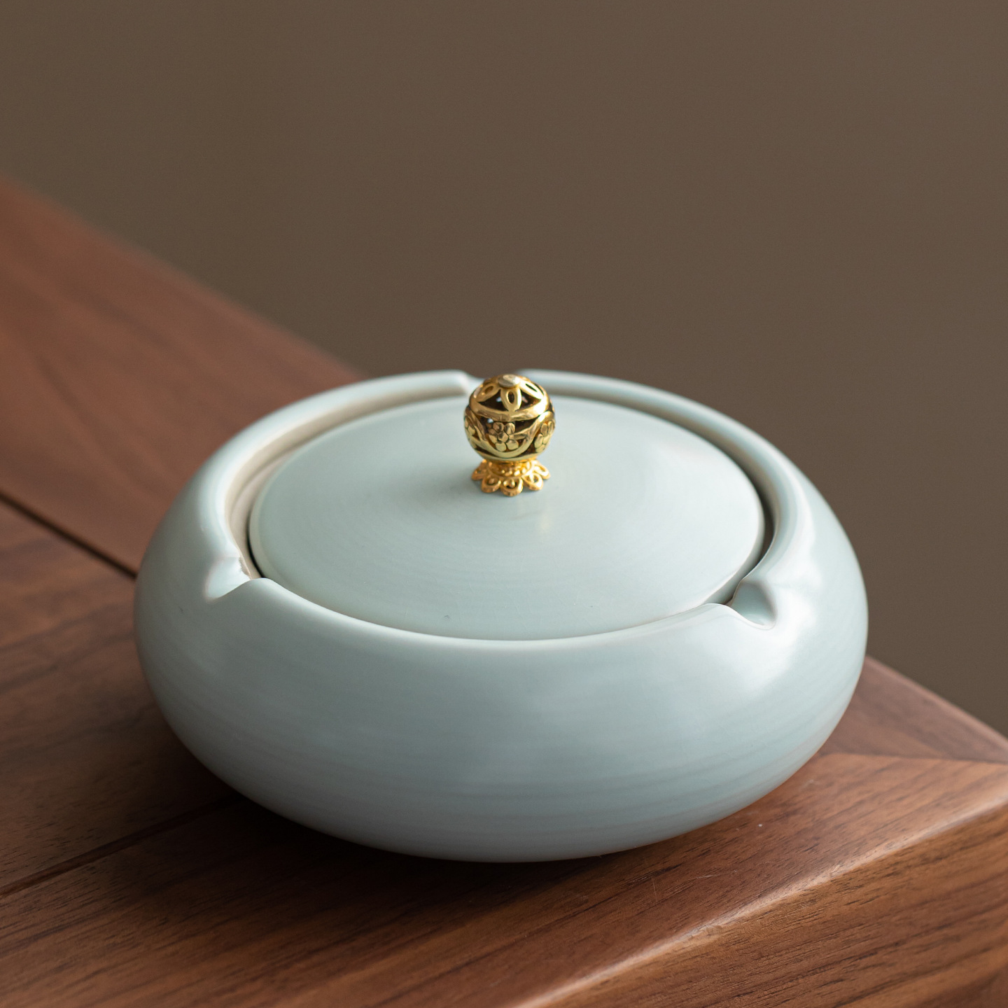 冬未汝窑天青带盖陶瓷烟灰缸家用纯色防风灰缸办公室轻奢烟盅