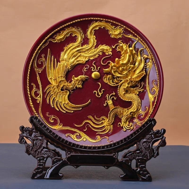 高档支架紫砂朱砂龙凤呈祥盘子摆件客厅装饰艺品送礼新人新婚结婚