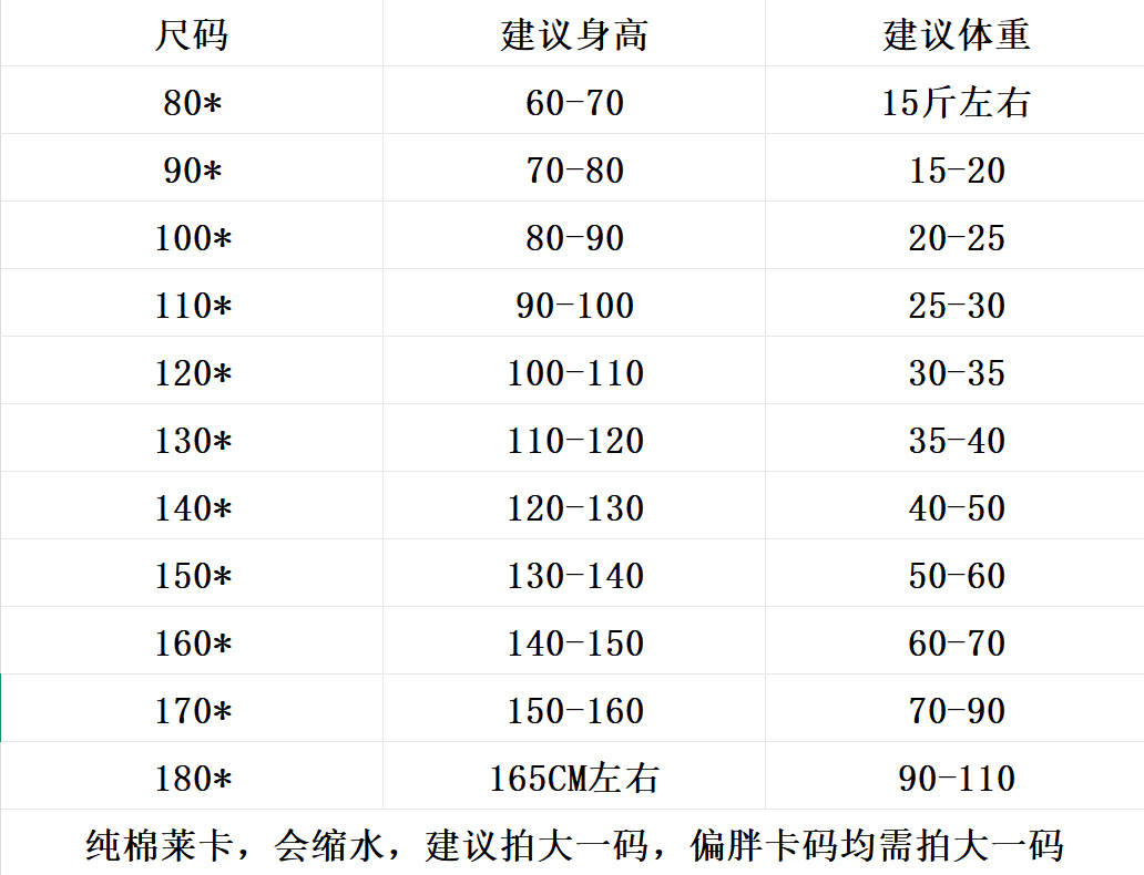 适合身高 80码【建议身高60-70cm】可开档,90码【建议身高70-80cm】可开档,100码【建议身高80-90cm】,110码【建议身高90-100cm】,120码【建议身高100-110cm】,130码【建议身高110-120cm】,140码【建议身高120-130cm】,150码【建议身高130-140cm】,160码【建议身高140-150cm】,170码【建议身高150-160cm】,180码【建议身高165cm左右】