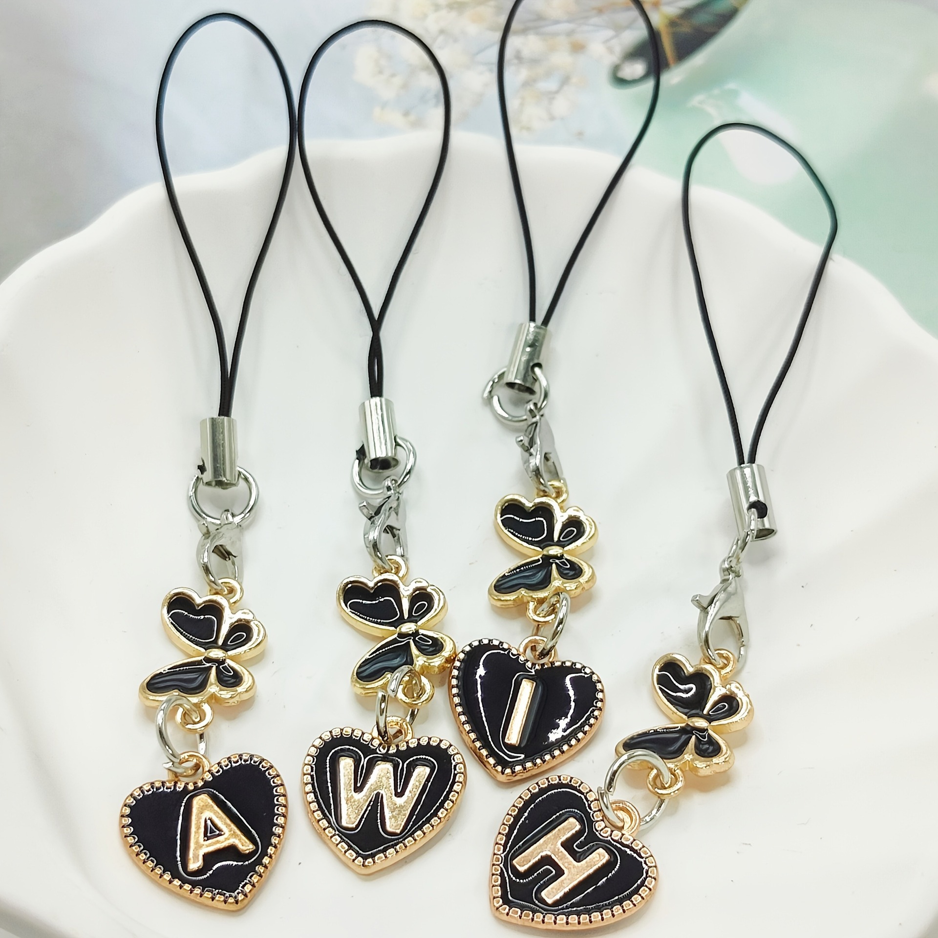 欧美跨境热销黑金色26字母爱心手机挂绳蝴蝶四叶草DIY饰品礼物