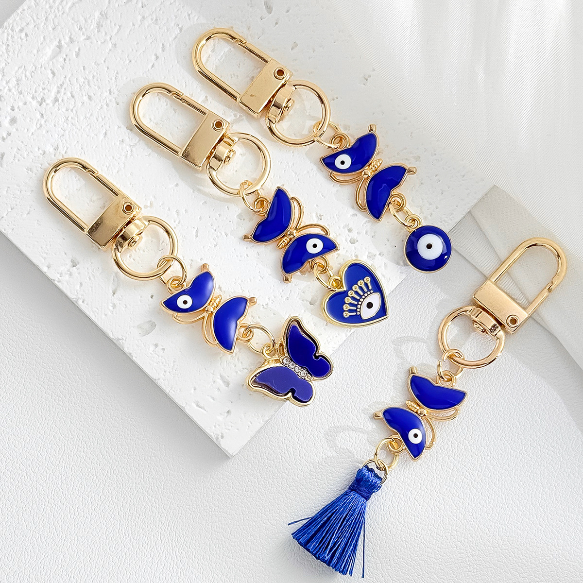 新款跨境蓝色蝴蝶钥匙扣恶魔之眼包包挂件蝴蝶流苏装饰礼物
