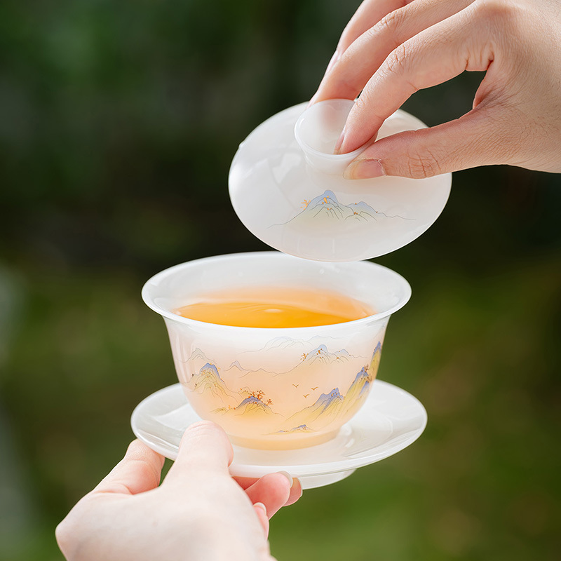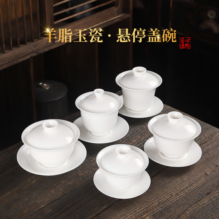 璞玉德化高档羊脂玉瓷陶瓷三才盖碗可悬停泡茶碗茶杯家用茶具套装