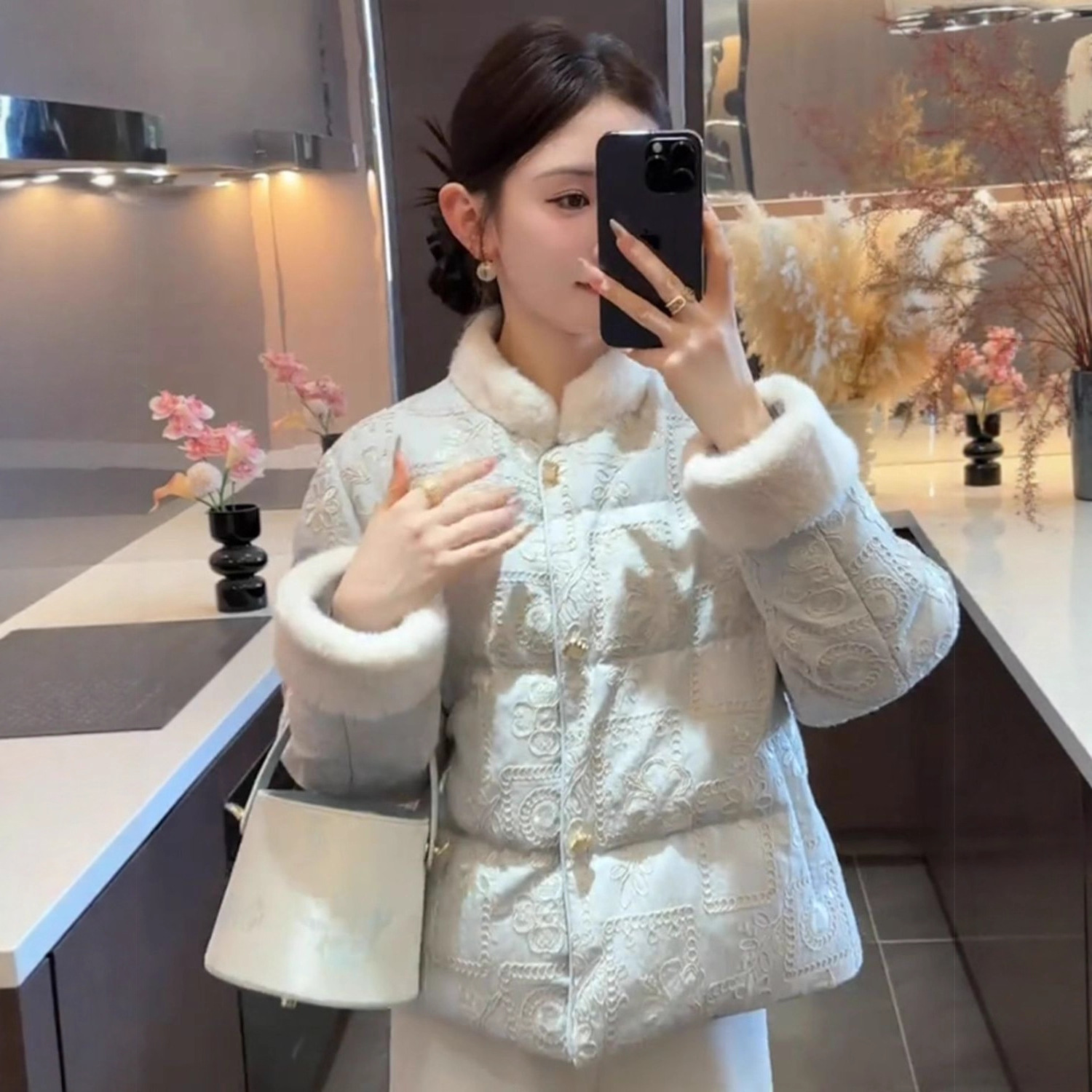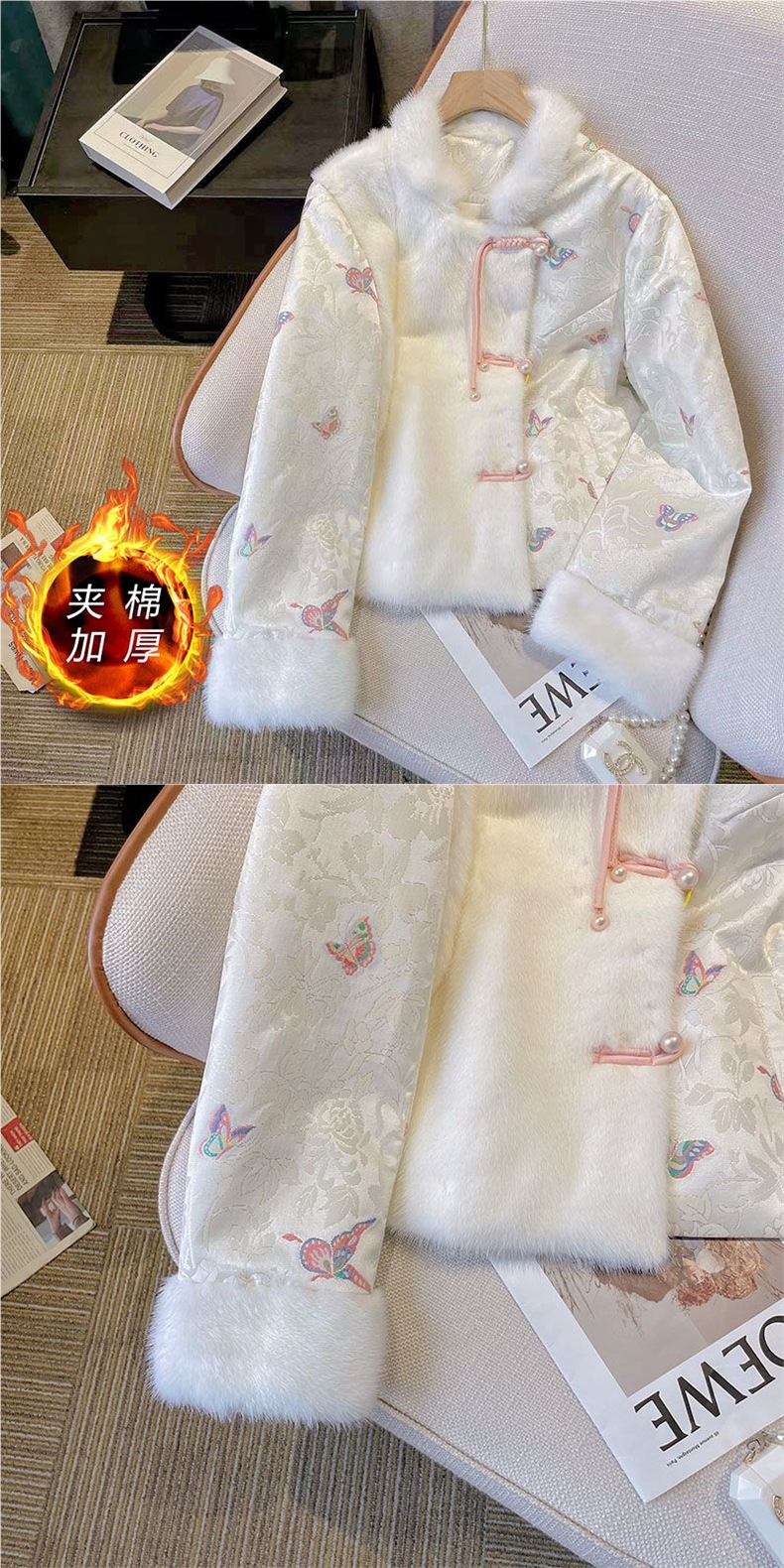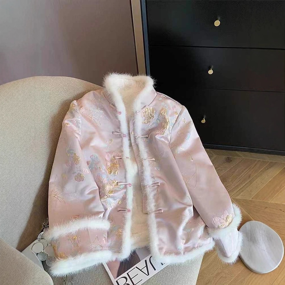 粉色新中式重工刺绣仿水貂毛棉服女2025冬季国风高级感夹棉外套秋