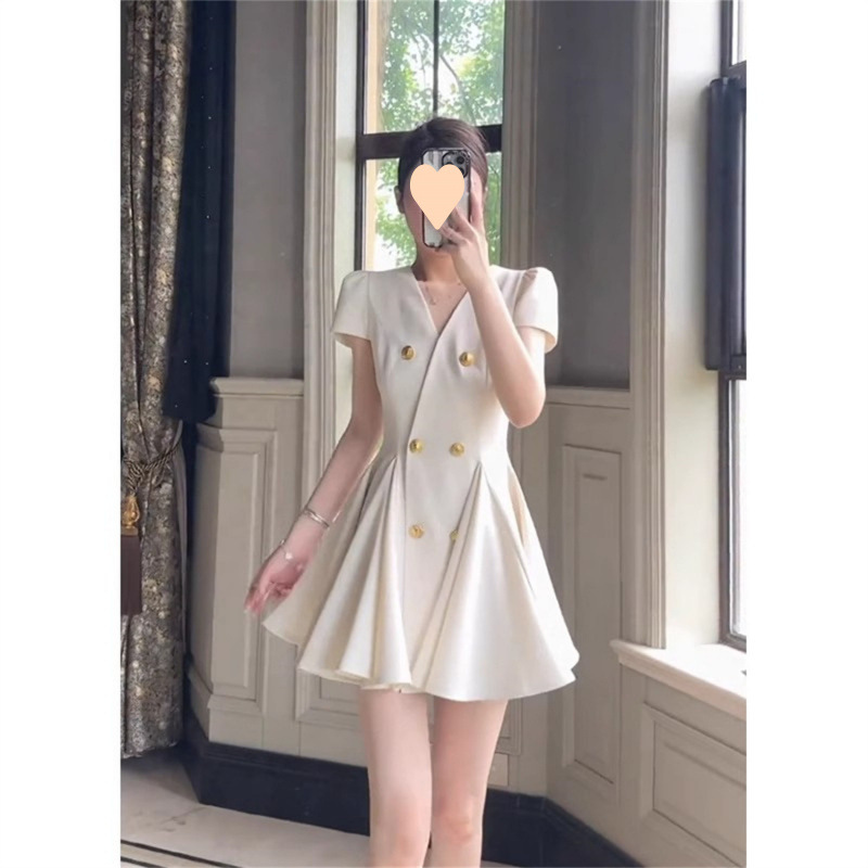 フランス社交界の女性の気質半袖ドレス小柄な夏の新しいスタイルのウエストダブルブレストスーツショートスカート女性用