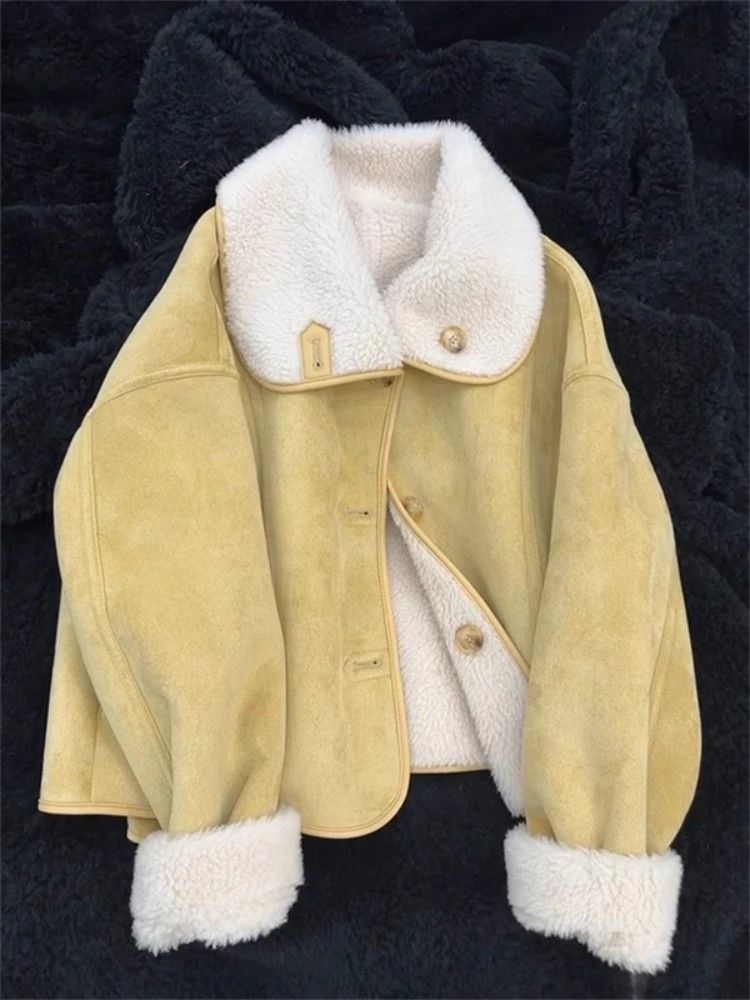 黄色翻领单排扣羊羔毛外套女冬季加厚感气质宽松显瘦开衫上衣