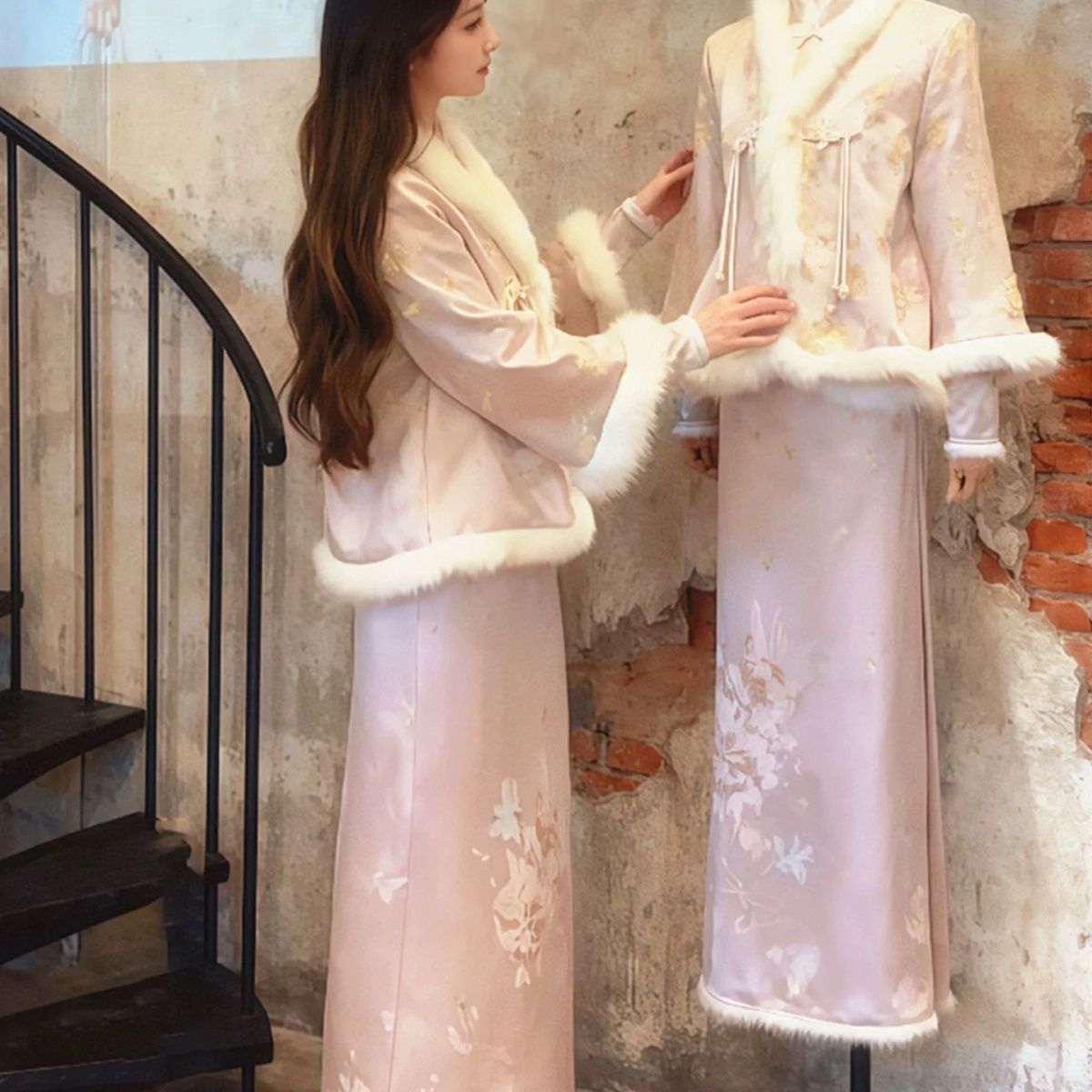 夹棉保暖2025冬季新款新中式气质国风外套旗袍连衣裙女装时尚套装
