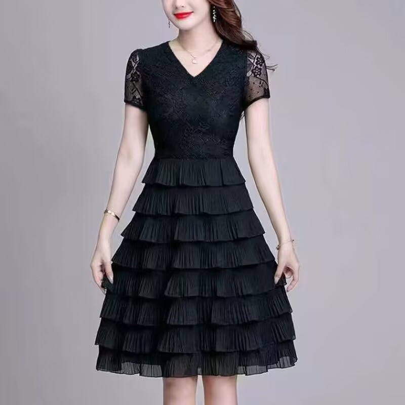 夏の新しい女性の襟大きいサイズ痩身ケーキスカート多用途レースステッチシフォンファッション年齢軽減ドレス女性