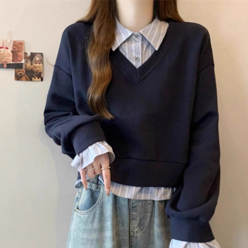 ストライプシャツスプライシング襟右肩ネイビーブルー長袖スウェットシャツレディース秋冬大きいサイズファットフェイクツーピーストップ