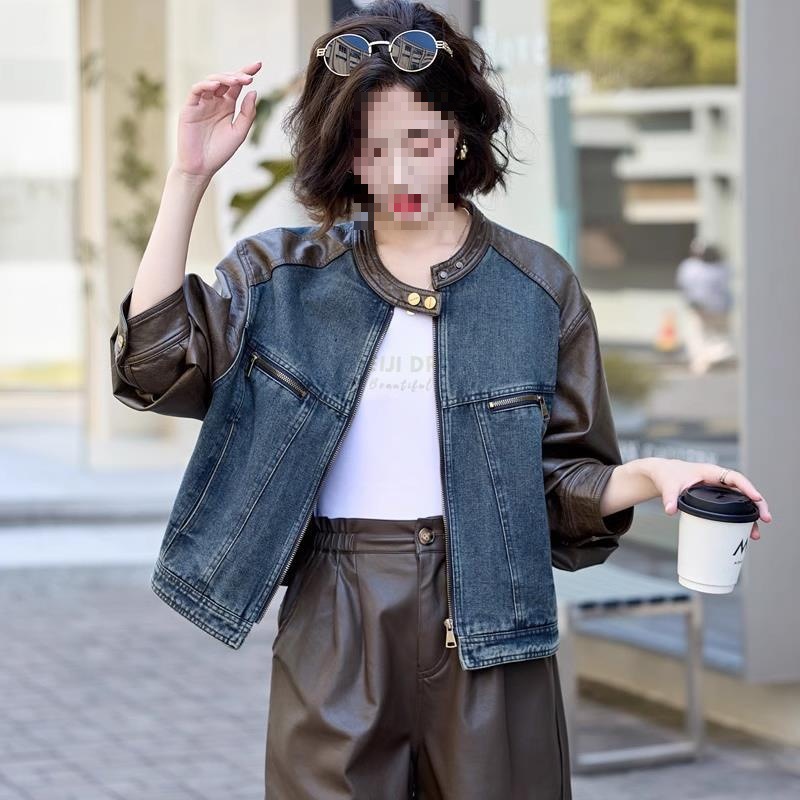 牛仔拼接皮拼接外套女年秋装新款今年流行小个子短外套