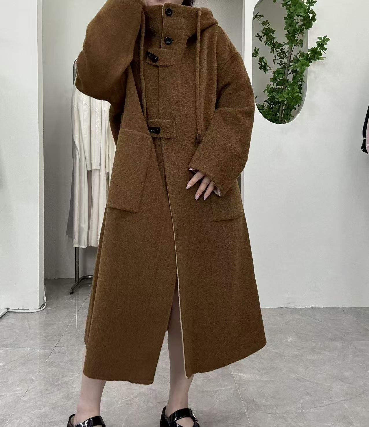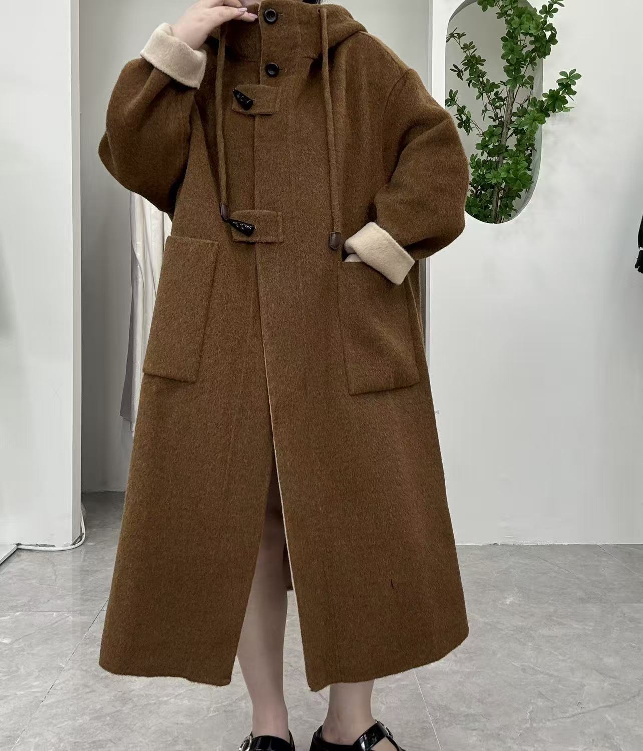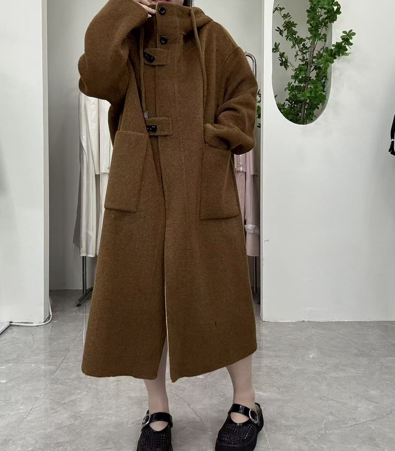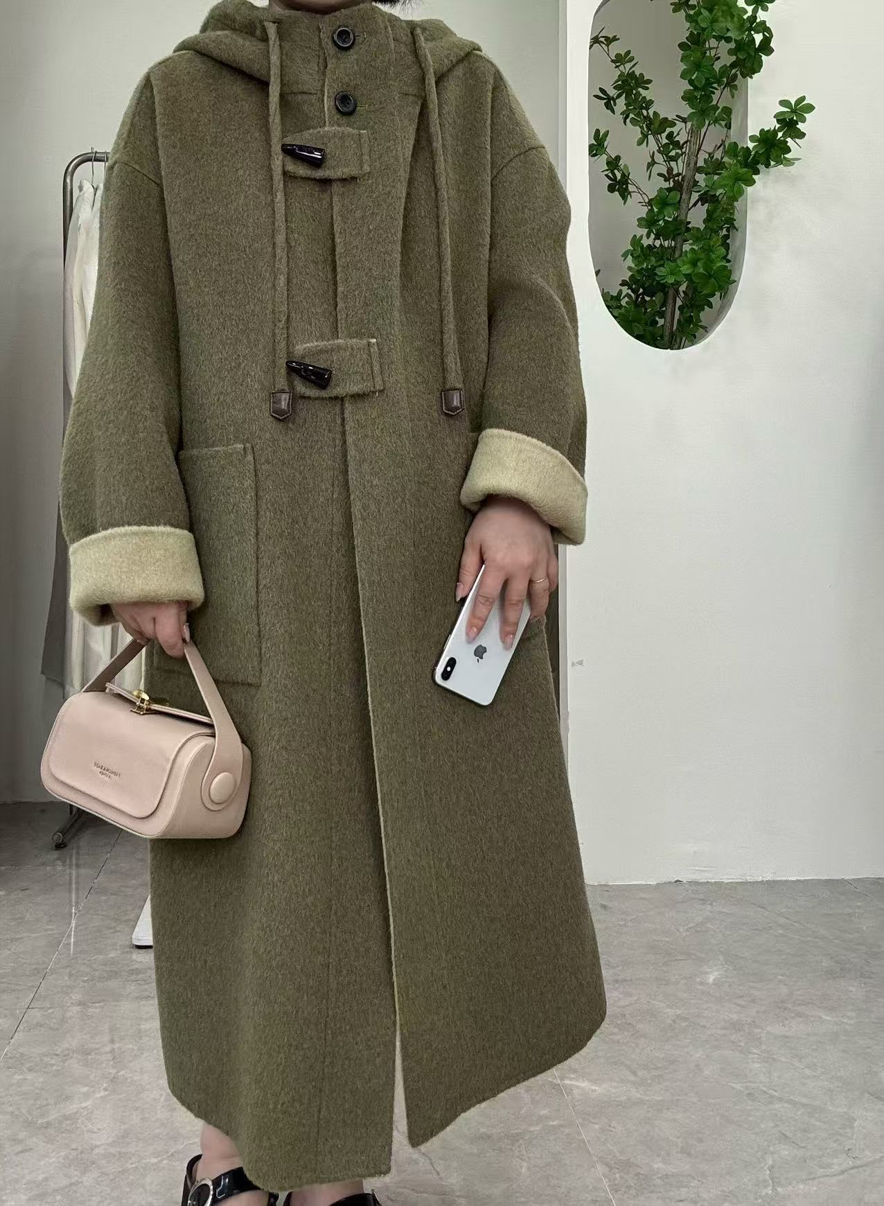 ソウルアカデミー2025秋冬韓国風フード付きホーンボタンワイドバージョンハイエンド増厚拡張両面ウールコート