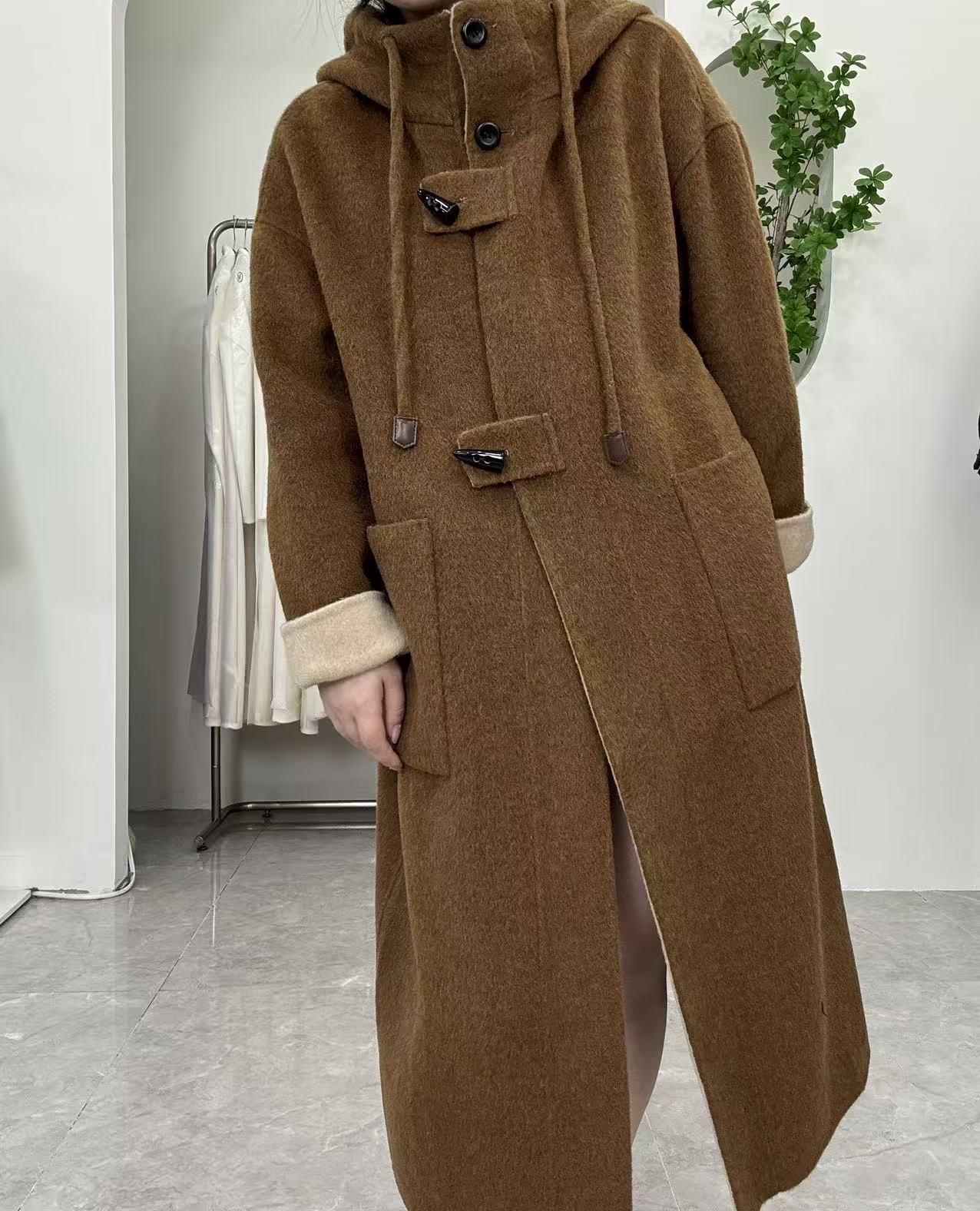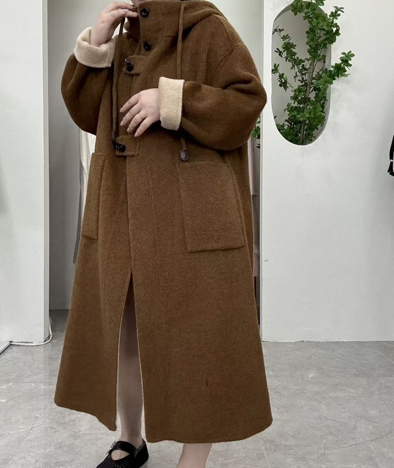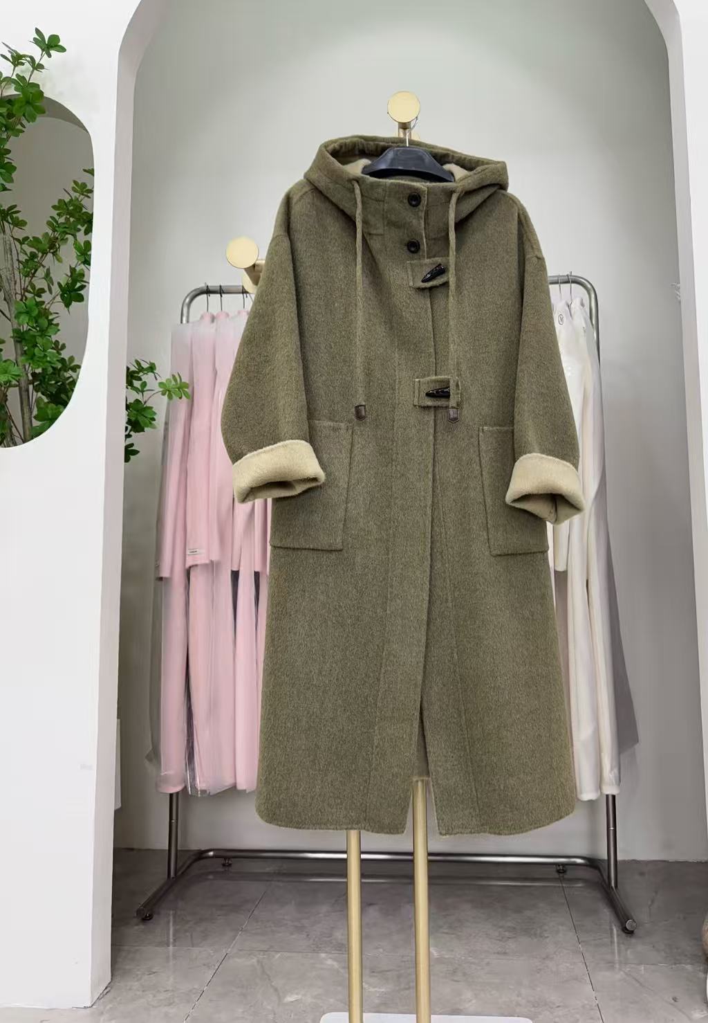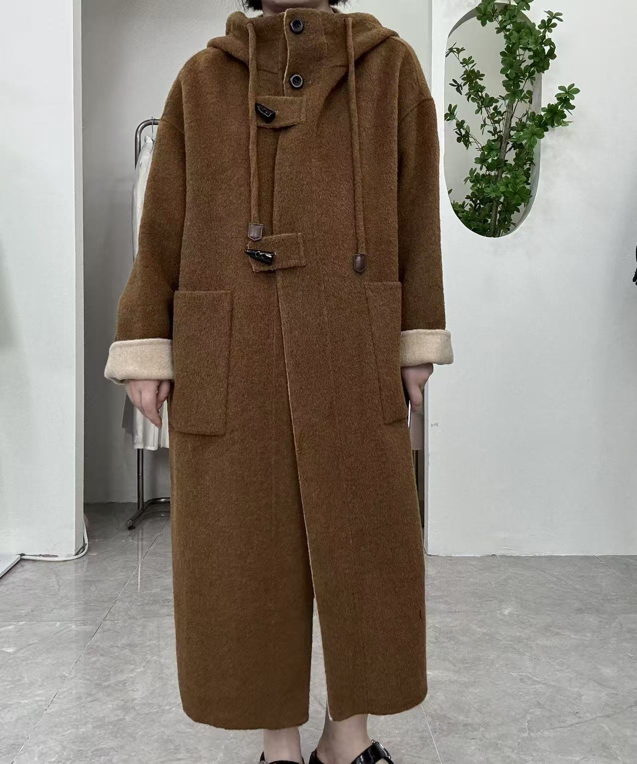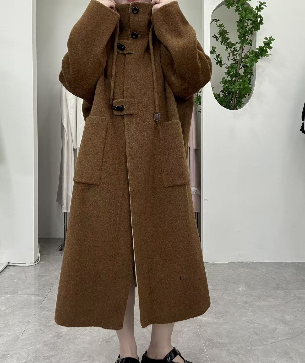 ソウルアカデミー2025秋冬韓国風フード付きホーンボタンワイドバージョンハイエンド増厚拡張両面ウールコート