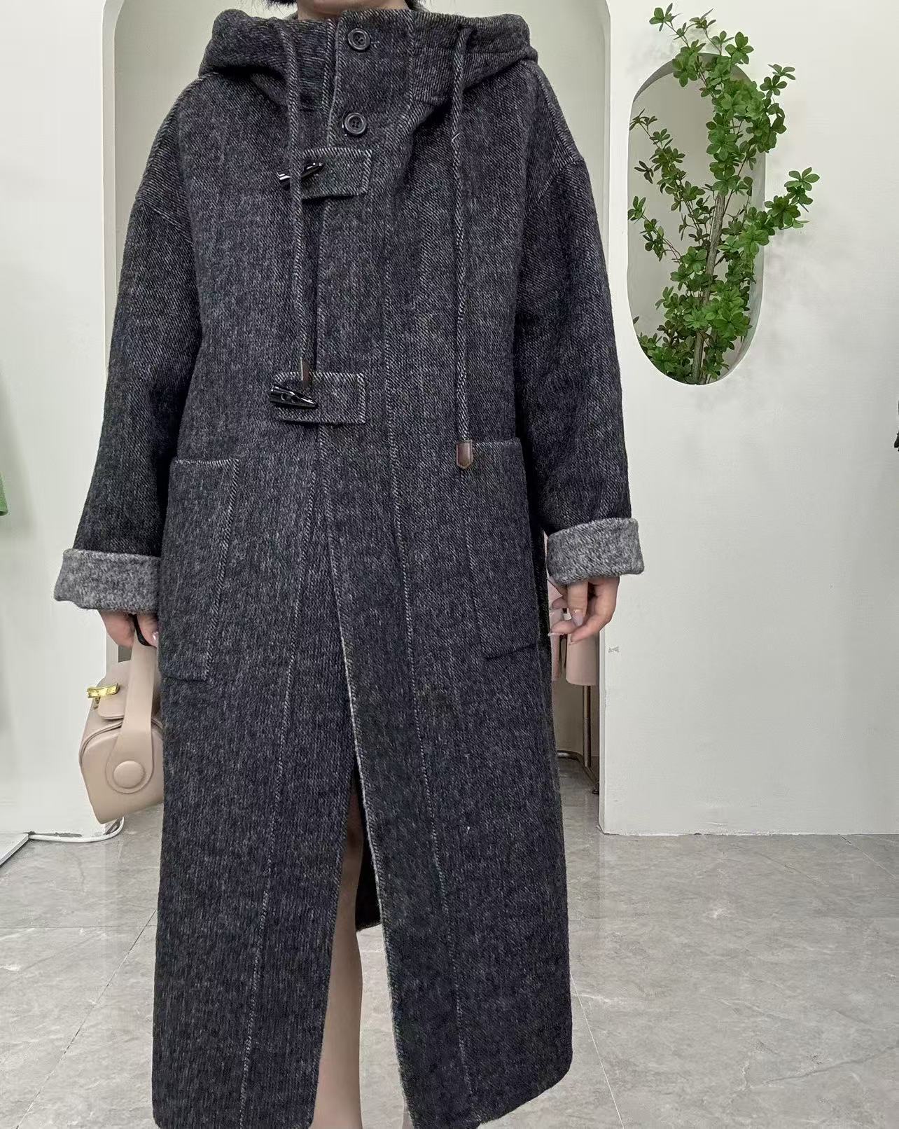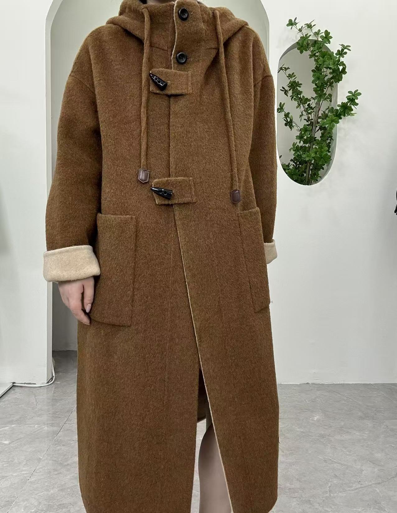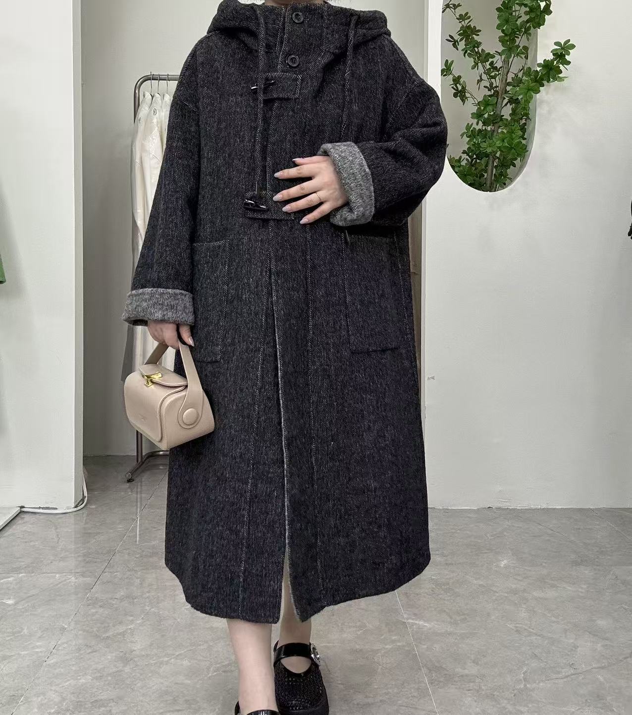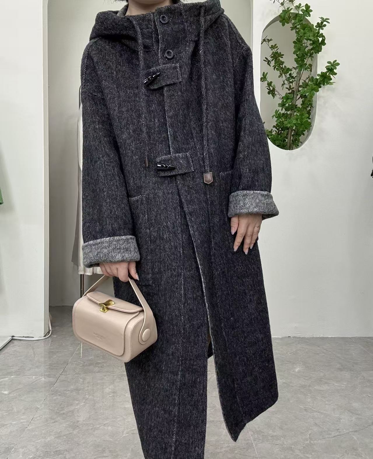 ソウルアカデミー2025秋冬韓国風フード付きホーンボタンワイドバージョンハイエンド増厚拡張両面ウールコート