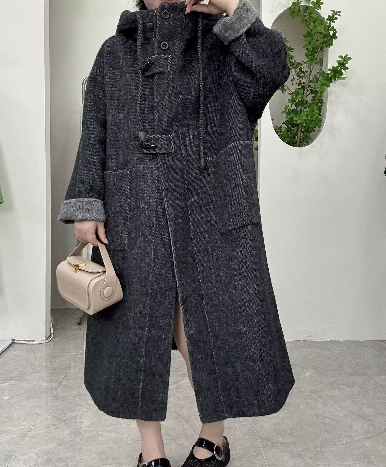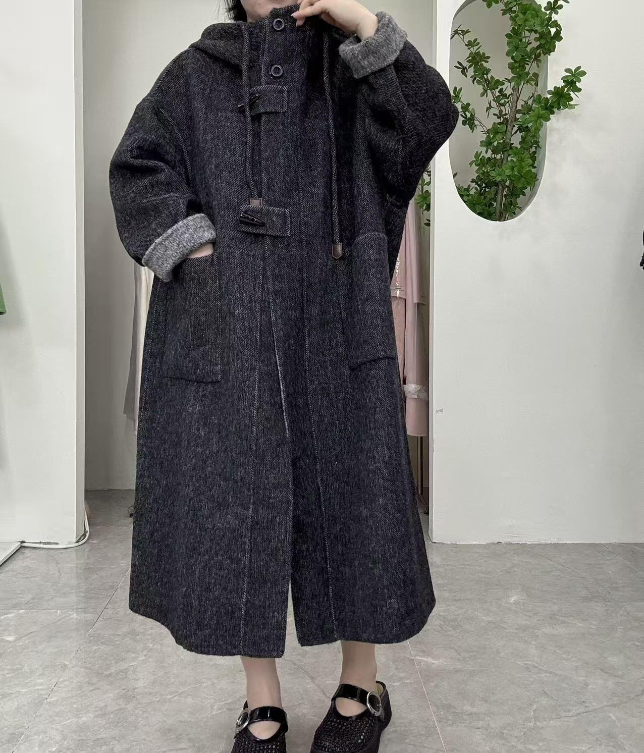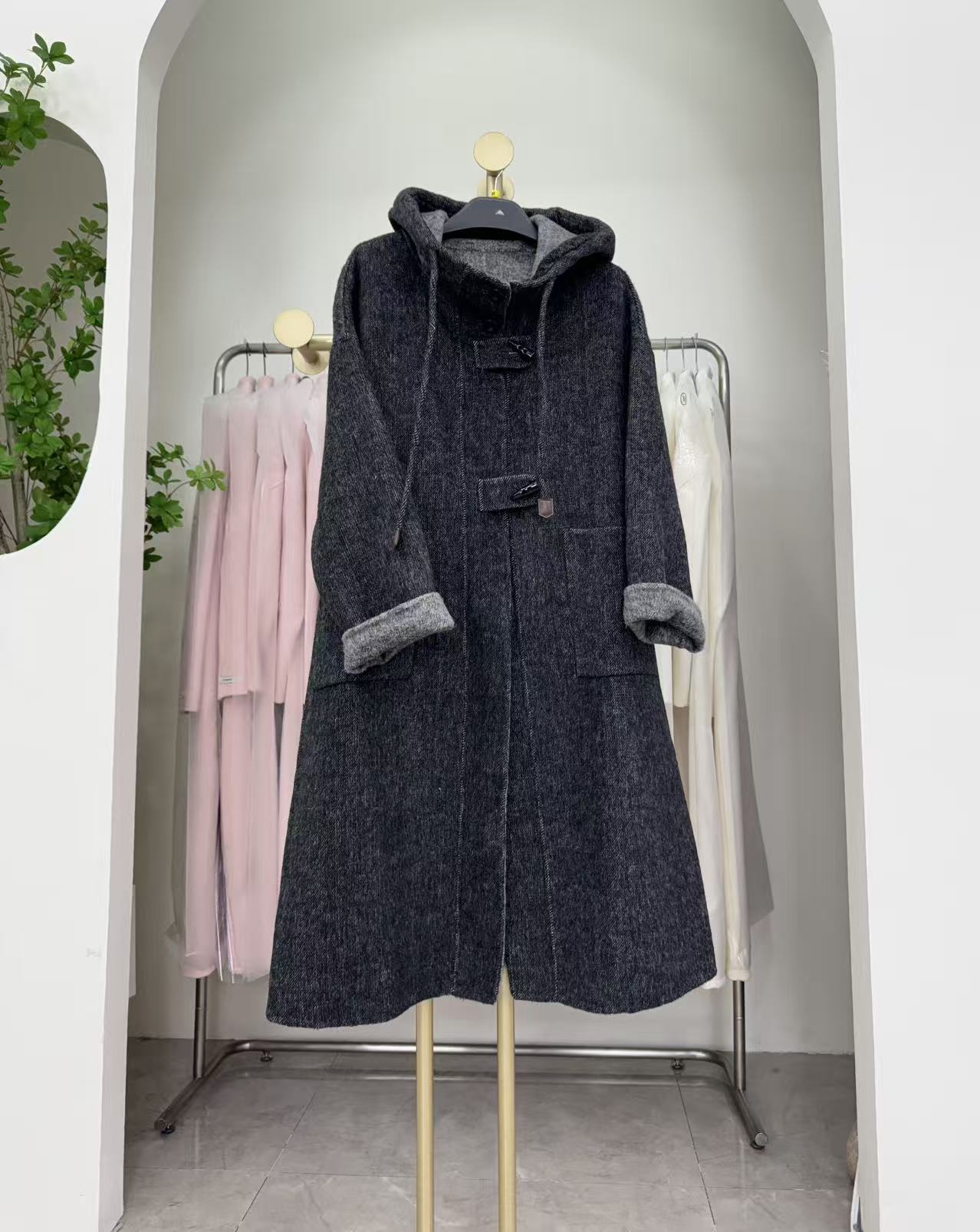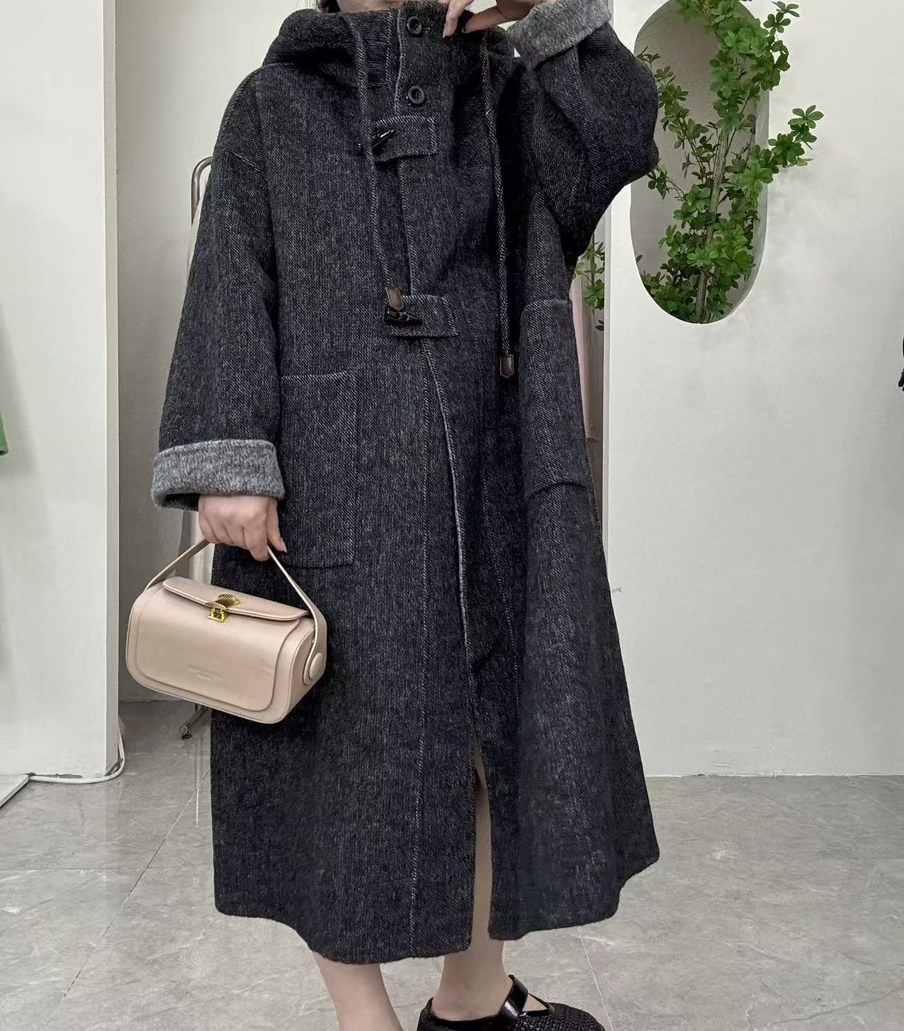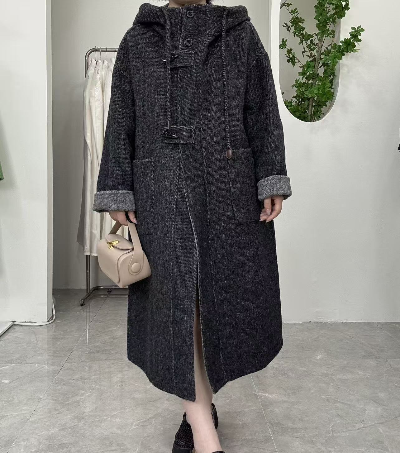 ソウルアカデミー2025秋冬韓国風フード付きホーンボタンワイドバージョンハイエンド増厚拡張両面ウールコート