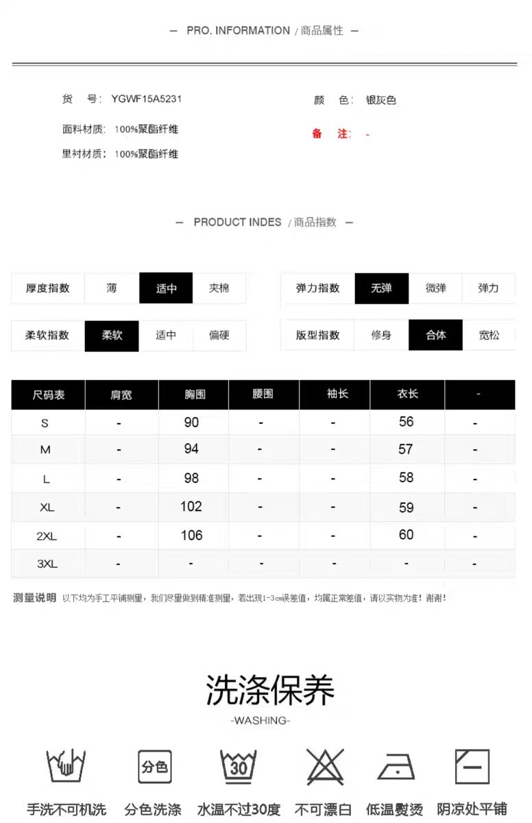 误差:由于测量方法不同;尺码数据存在1-4CM左右误差属于正常范围;不属于产品本身质量不符问题哦