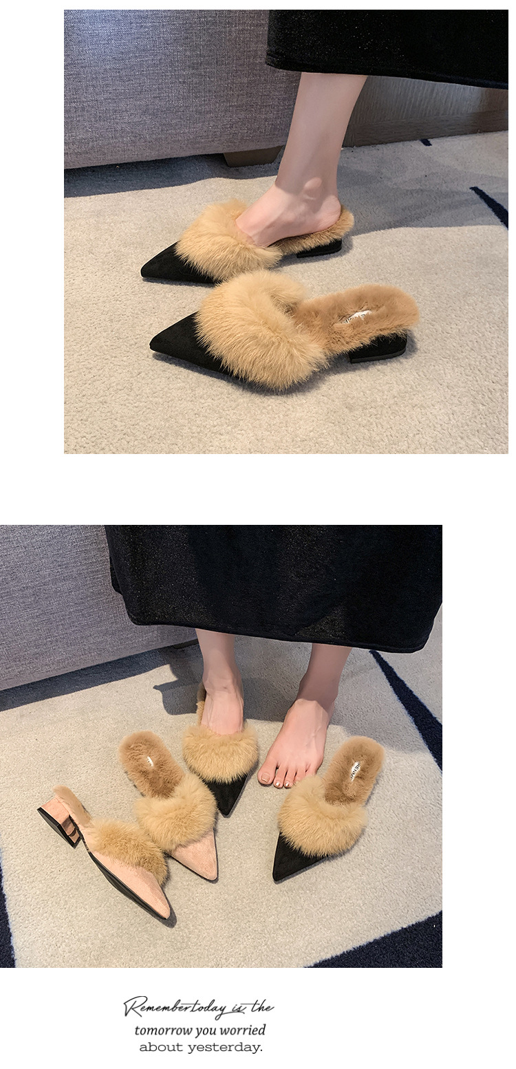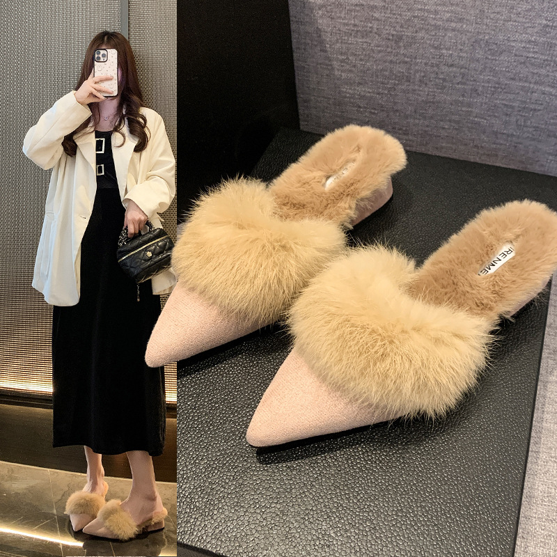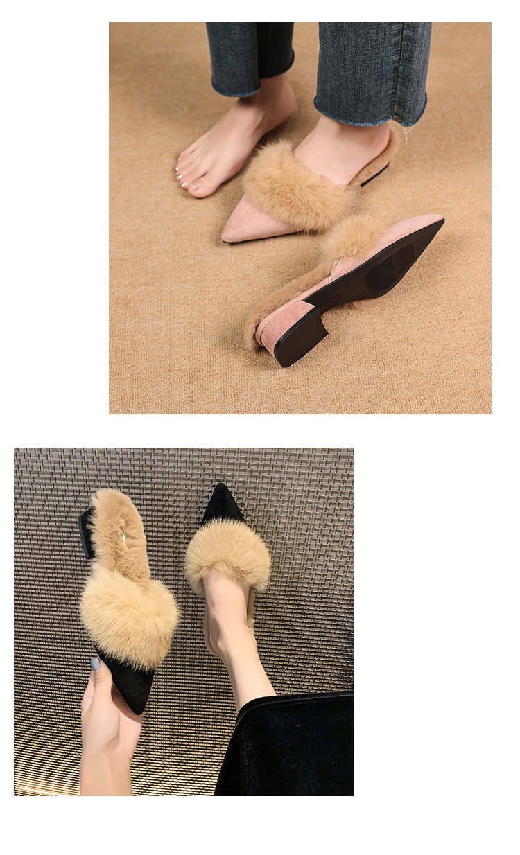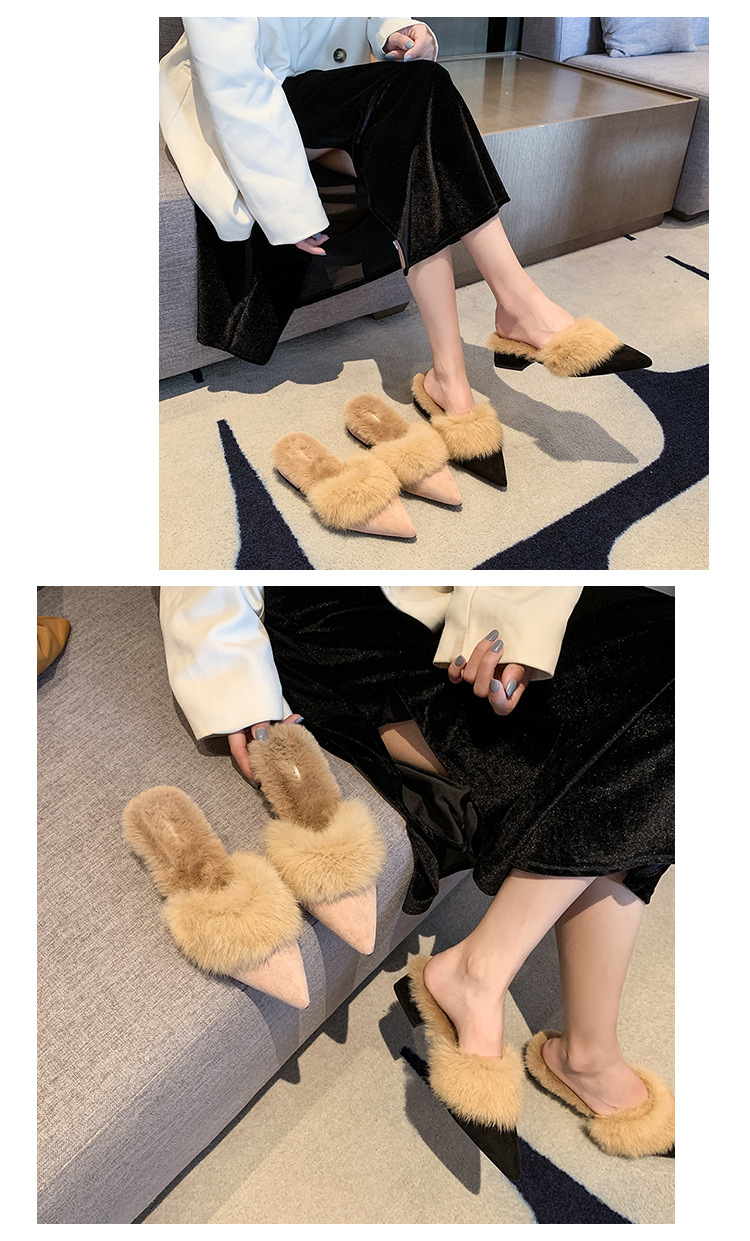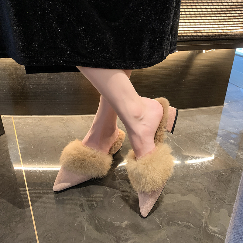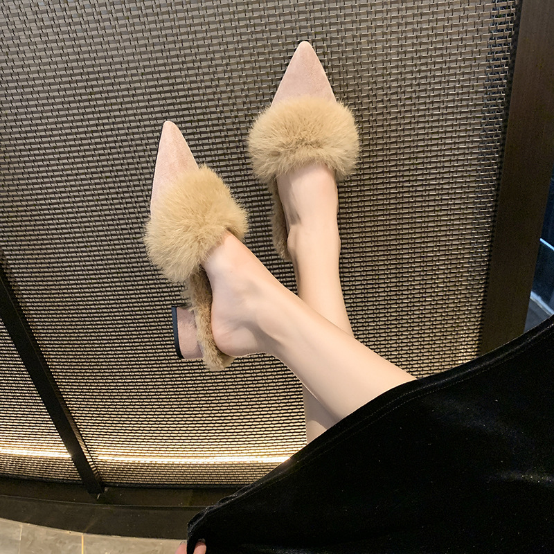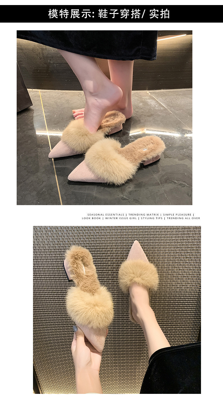 粗跟尖头加绒毛毛棉拖鞋女鞋子外穿秋冬季一脚蹬网红气质包头半拖