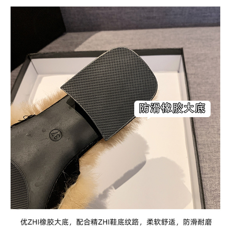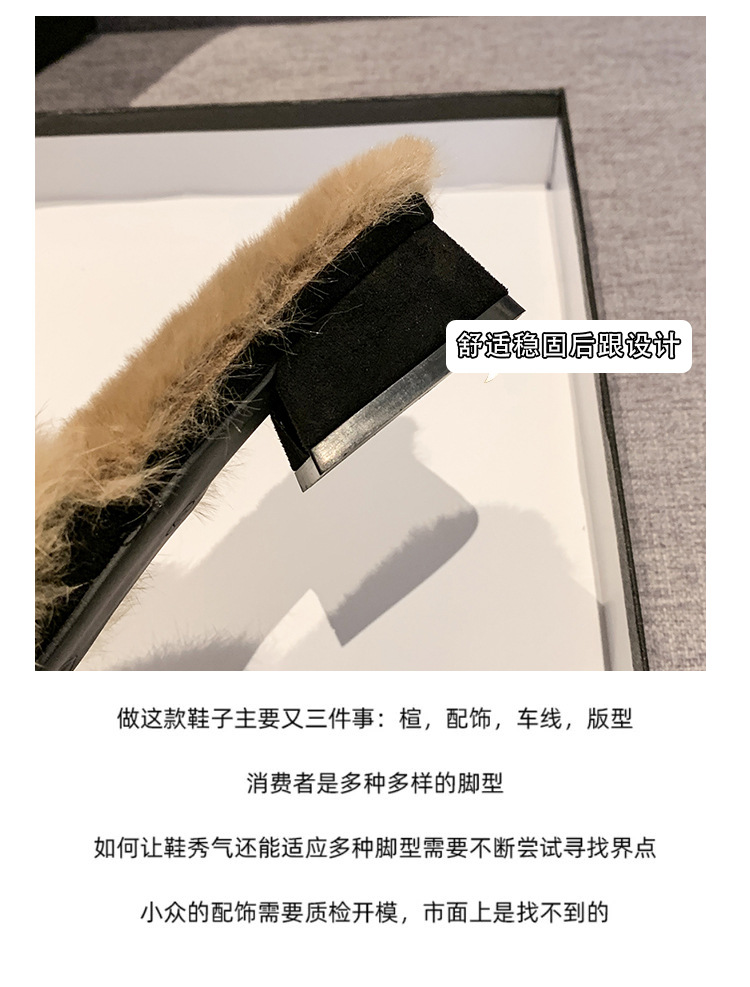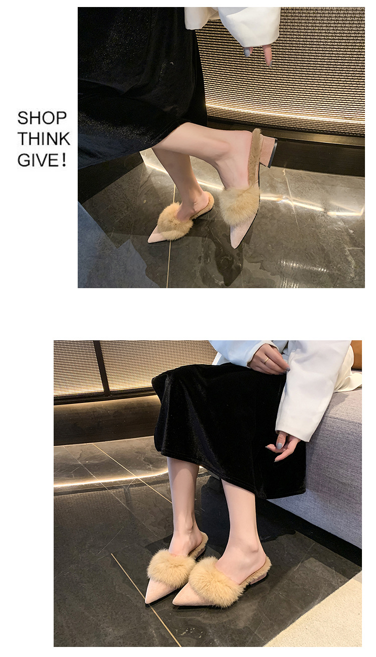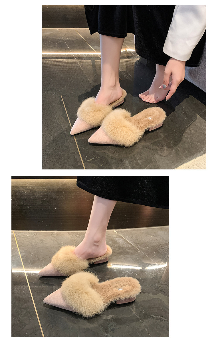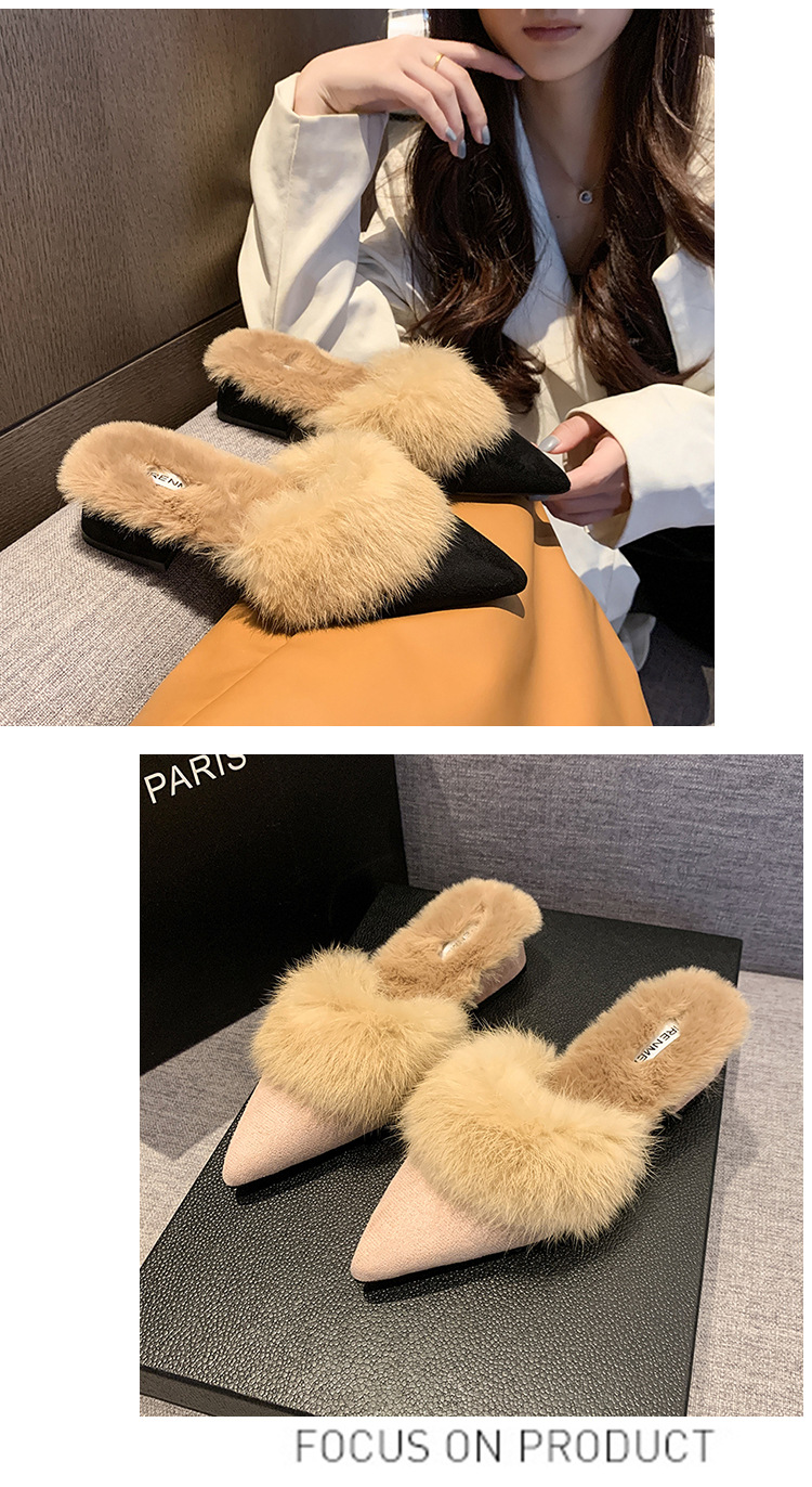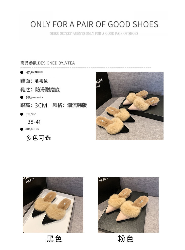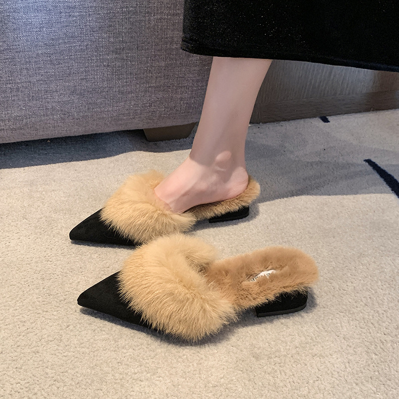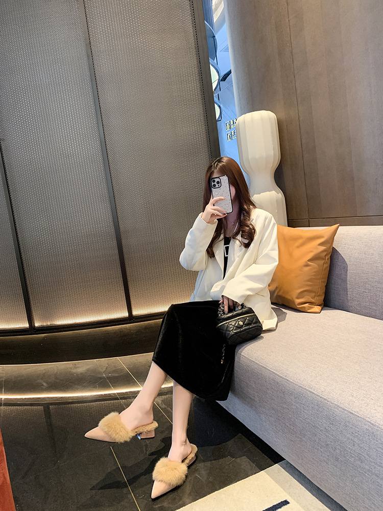 粗跟尖头加绒毛毛棉拖鞋女鞋子外穿秋冬季一脚蹬网红气质包头半拖