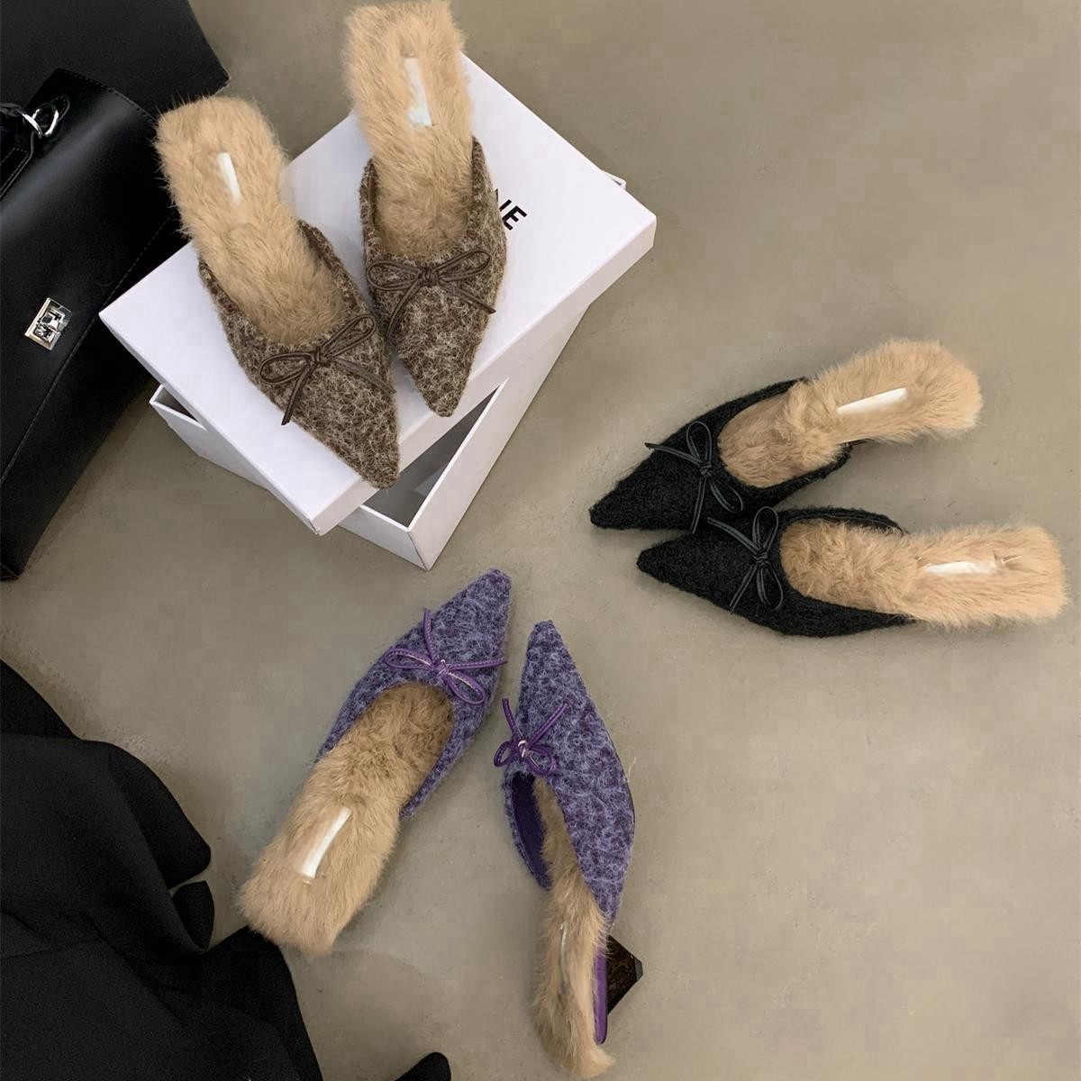 奶糯叽叽!温柔毛毛尖头拖鞋女2024冬季包头高跟鞋子米白色黑色