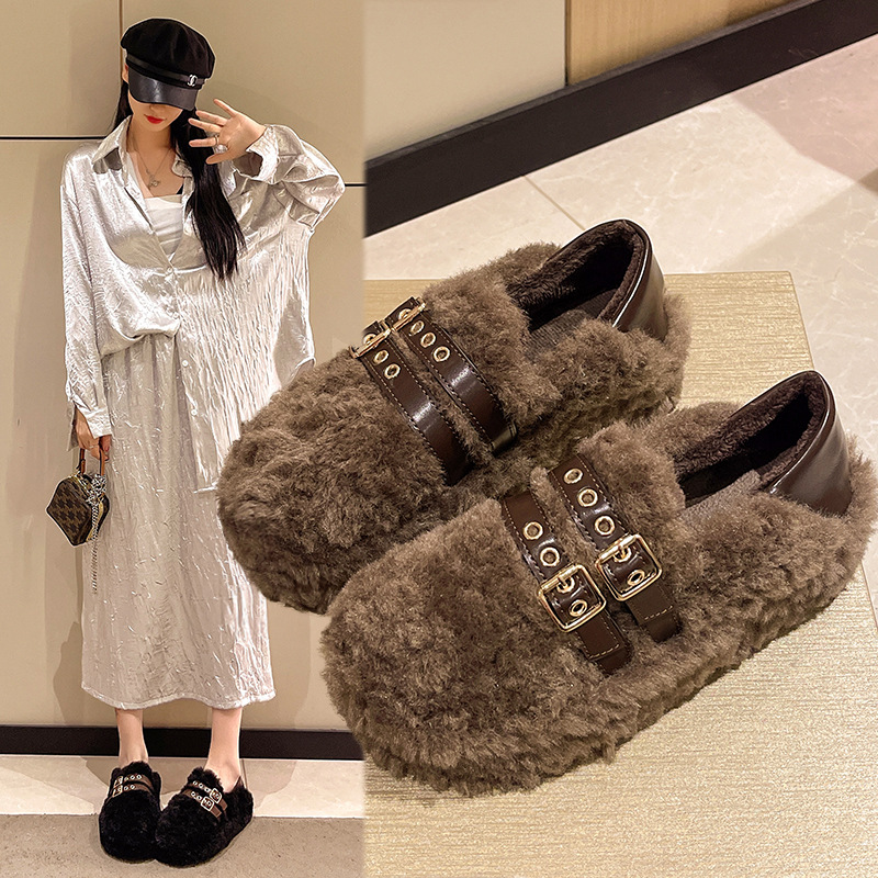 超人気のフランス風厚底メリージェーンファー付きシューズ レディース 春秋冬 外履き 2025年新作 ドビー靴 滑り止めコットンシューズ