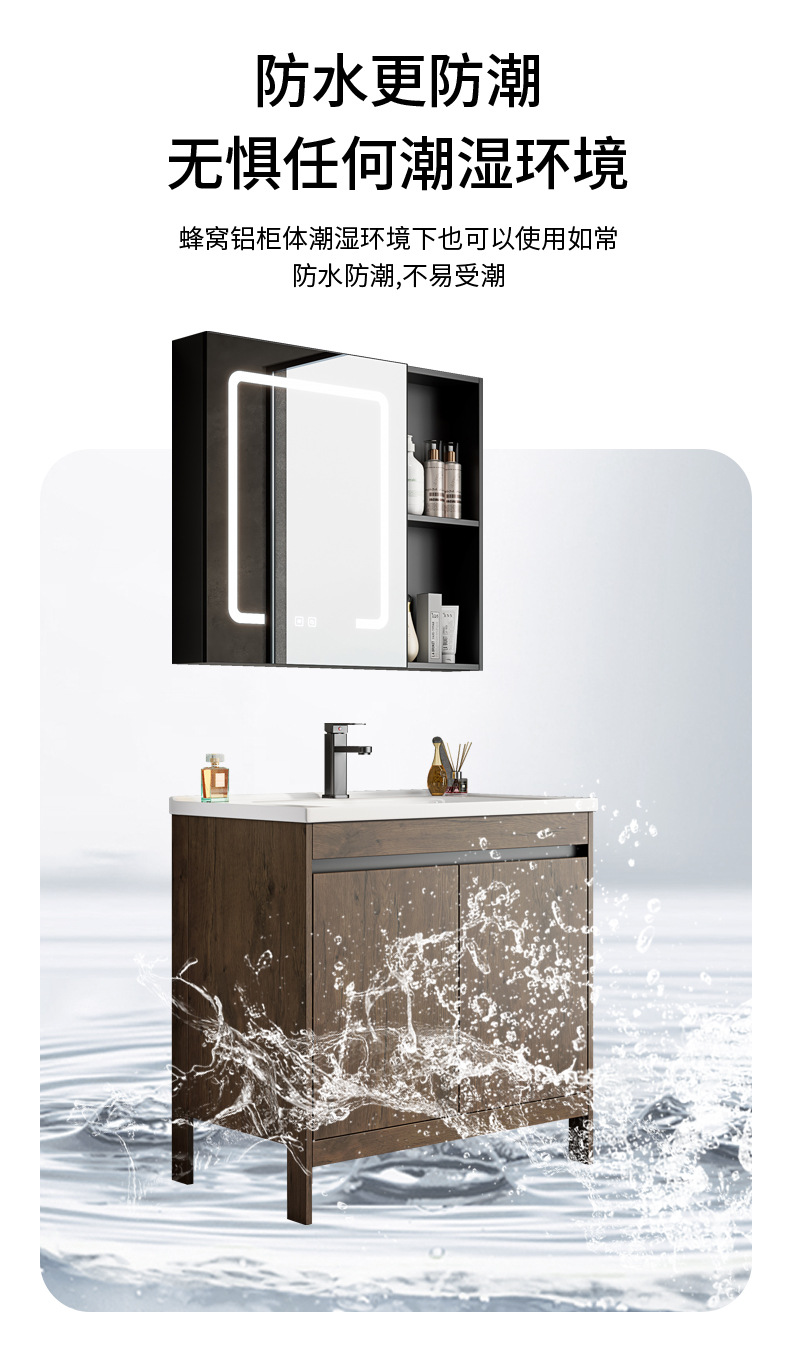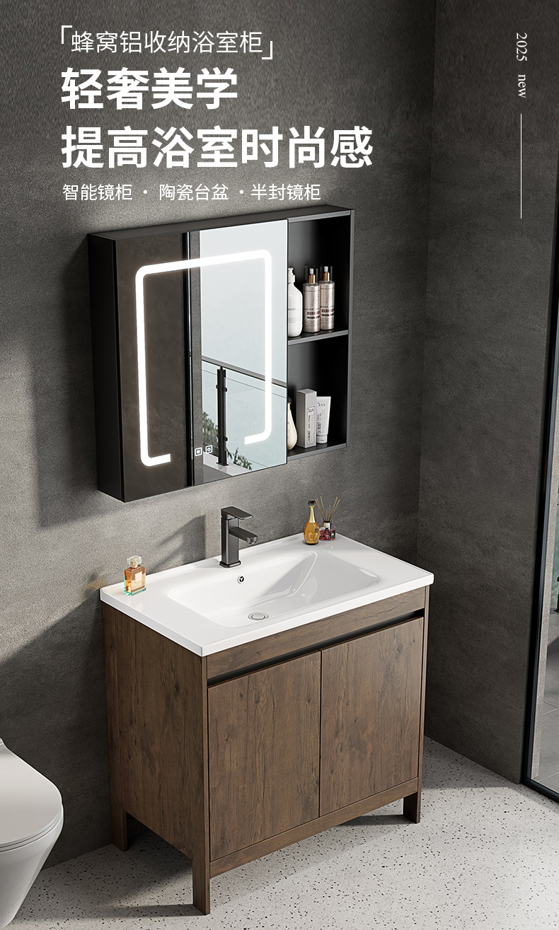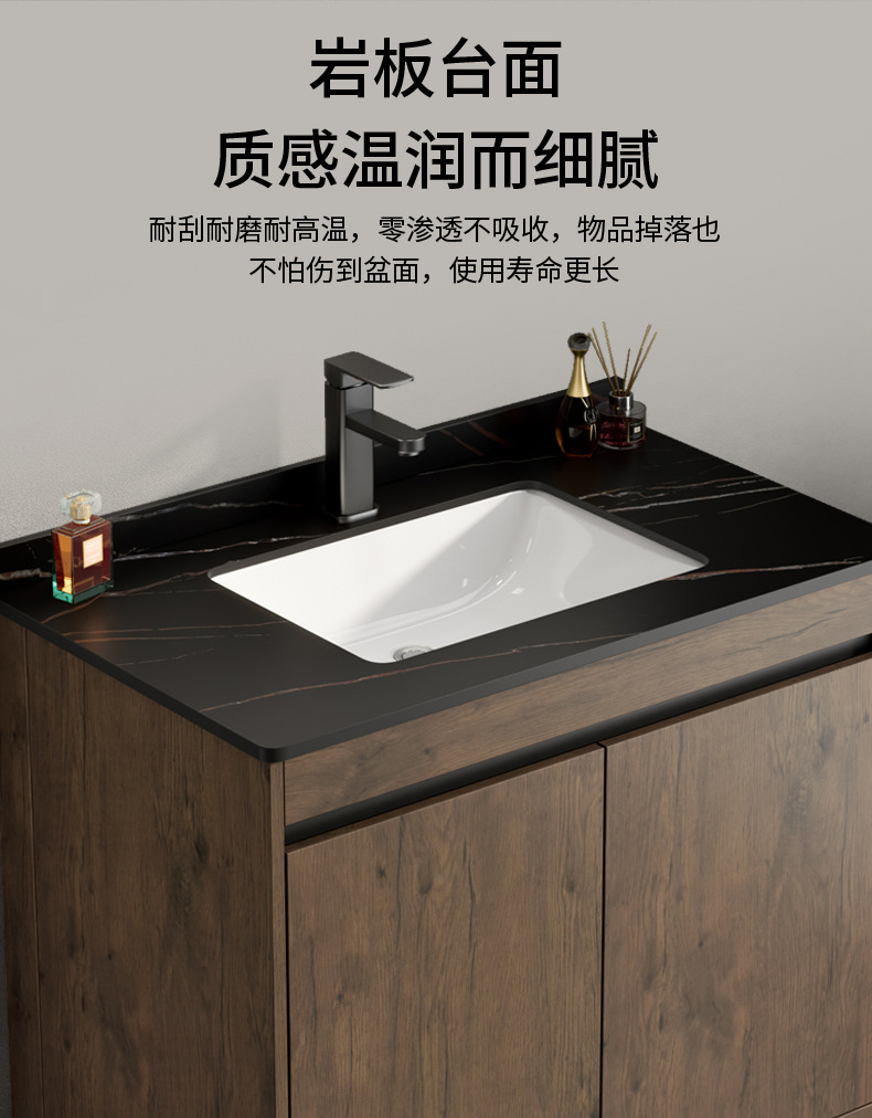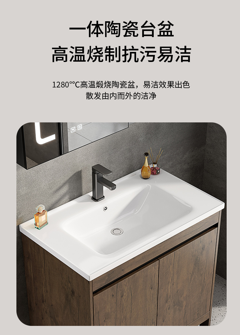 轻奢胡桃色柜体+陶瓷一体盆+智能镜柜