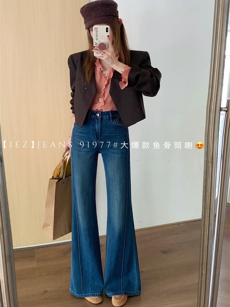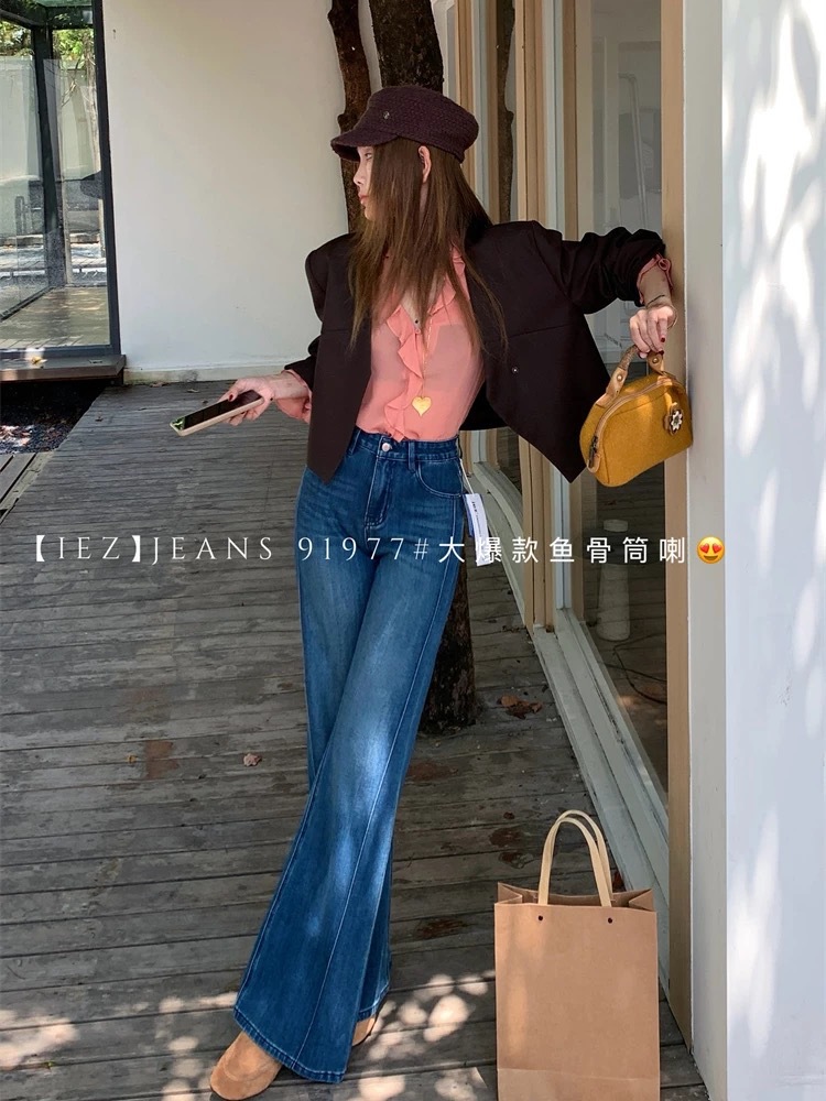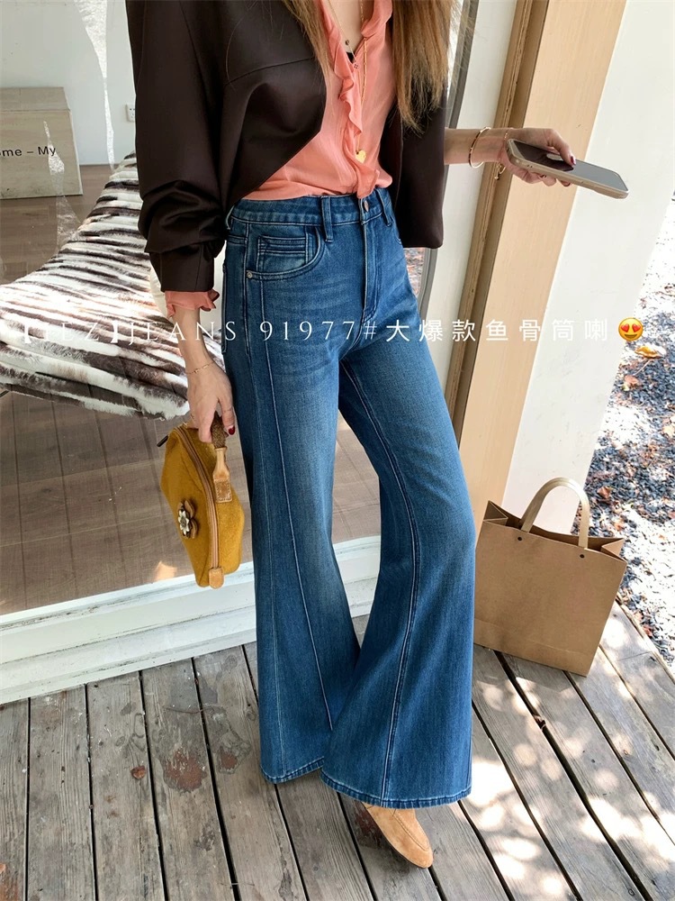 2025年新款高级鱼骨边气质显瘦筒喇裤不贴腿喇叭牛仔裤女微喇裤