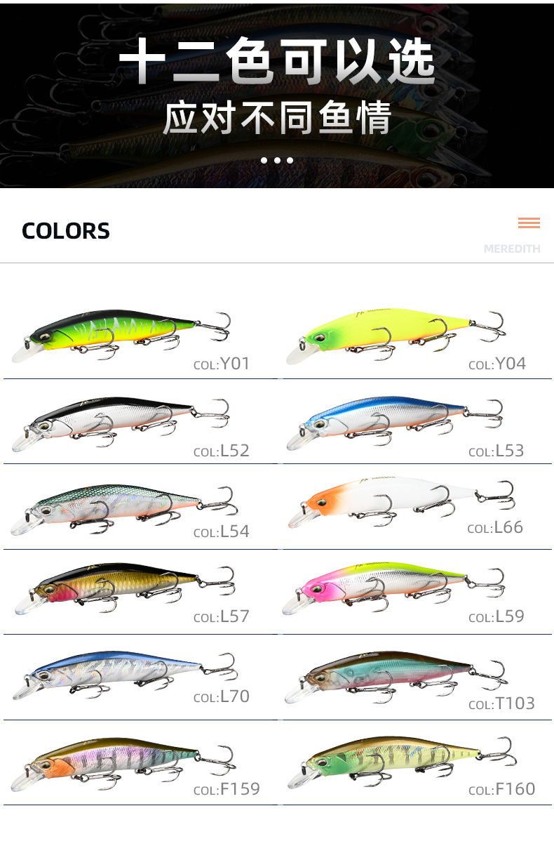 颜色 炫彩米诺-11cm-F159,绿色炫彩米诺-11cm-F160,黑背红肚米诺-11cm-L52,蓝背橘肚仿真米诺-11cm-L53,网纹绿背橘肚-11cm-L54,红头金腹-11cm-L57,粉头黄腹-11cm-L59,橘头白色-11cm-L66,蓝背橘头-11cm-L70,棕背绿粉腹-11cm-T103,黑背绿饵-11cm-Y01,绿头黄饵-11cm-Y04