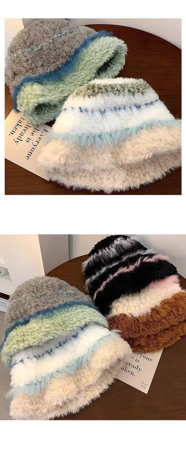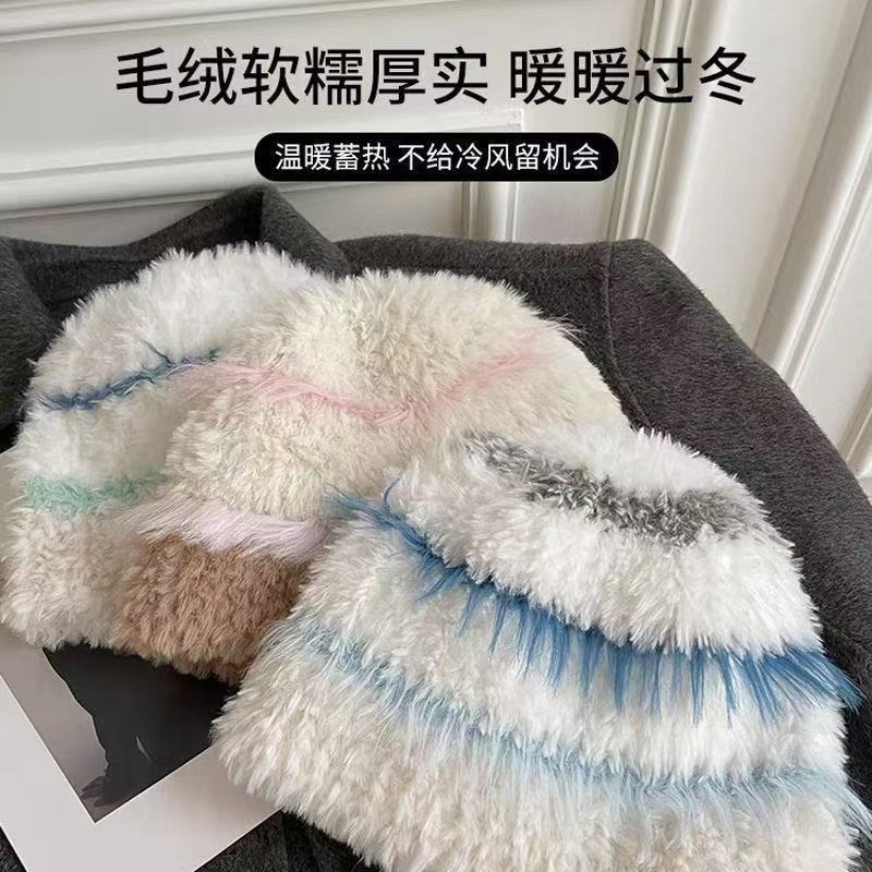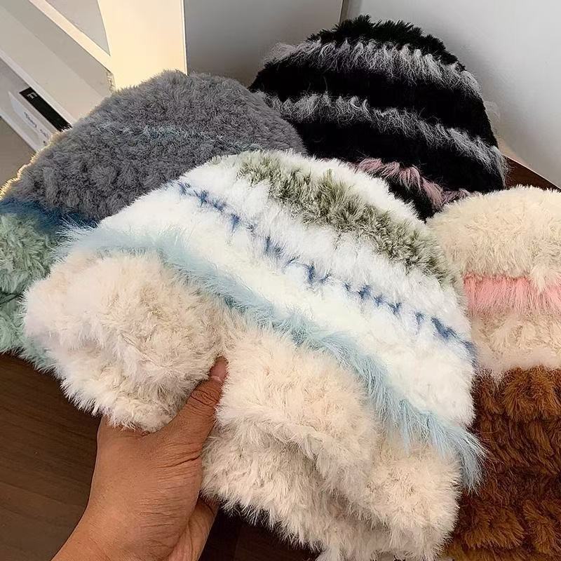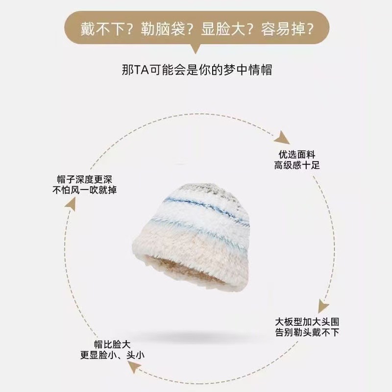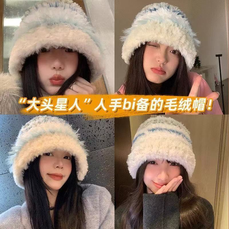 毛绒绒条纹帽子女显脸小针织帽保暖韩版可爱护耳毛线帽逛街大头围