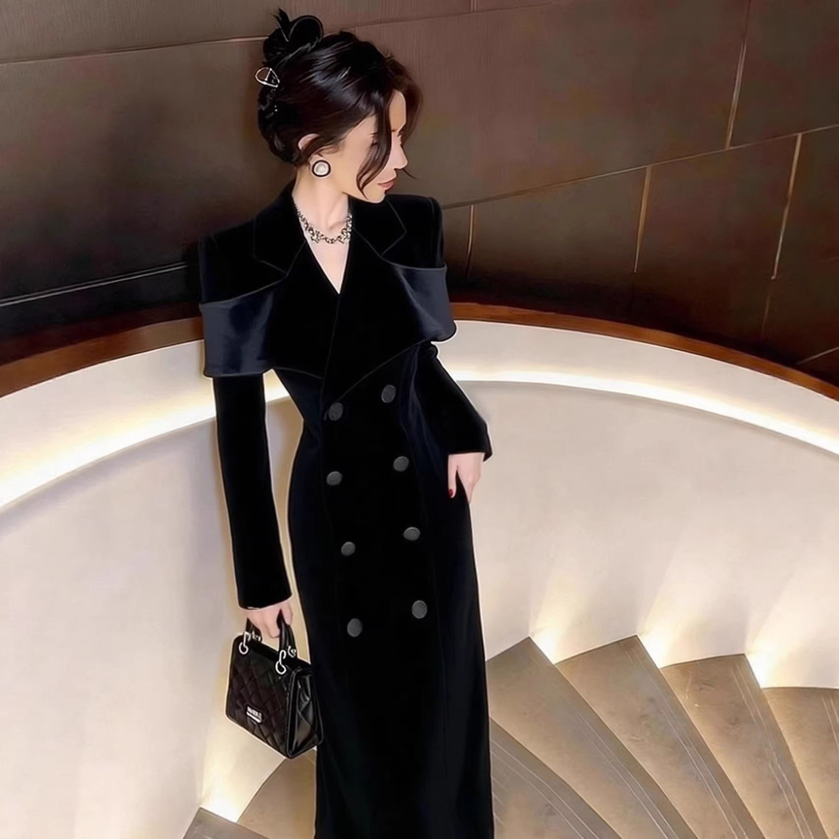 黑色丝绒西装连衣裙秋冬新款重要场合高端精致巨好看气质收腰长裙