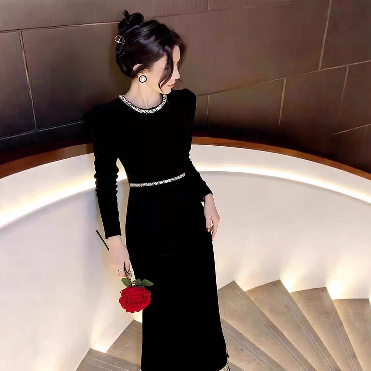 气质名媛黑色丝绒连衣裙秋冬新款轻奢高级感法式掐腰宴会礼服长裙