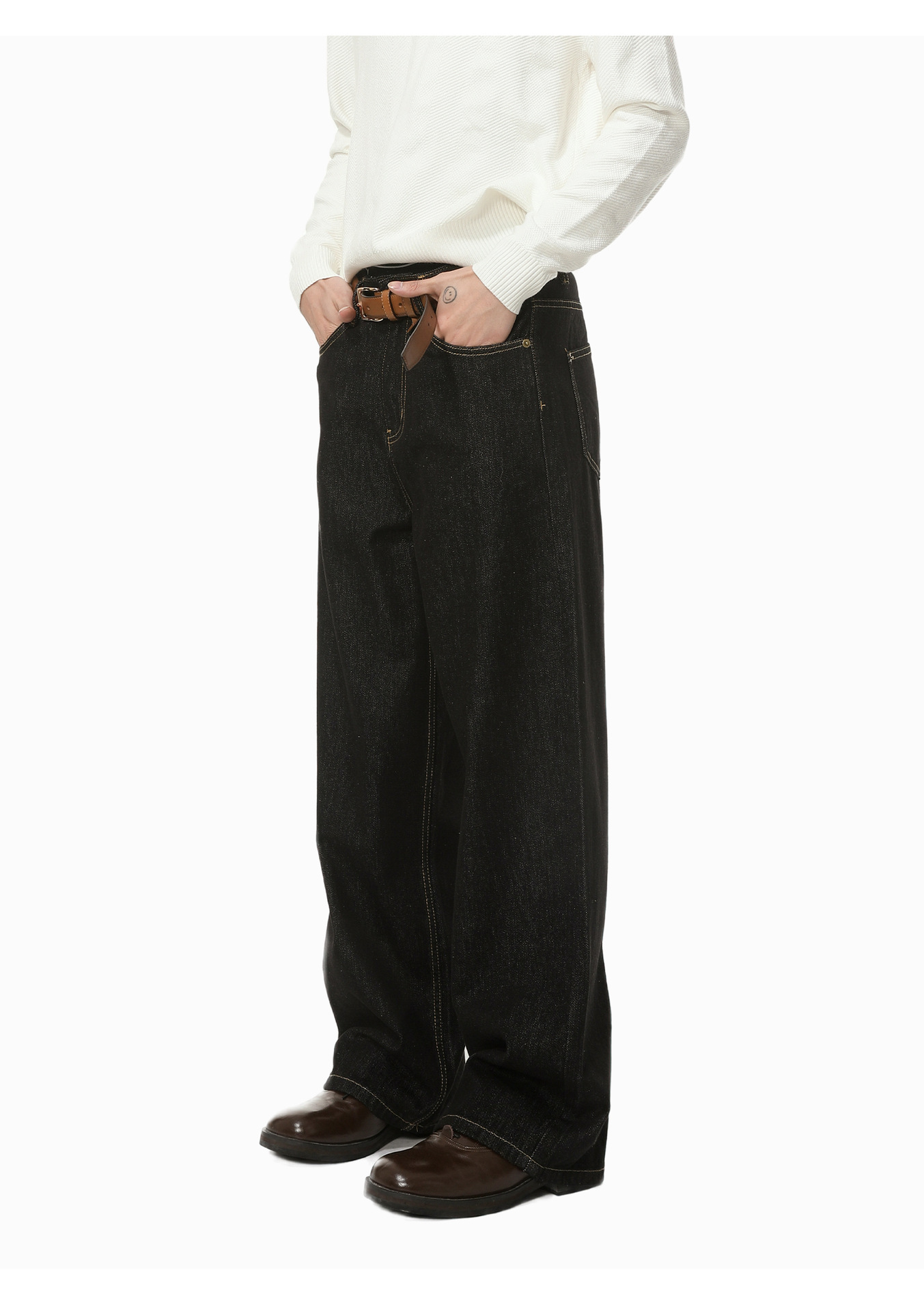 MTLCLOTHES男装|韩版口袋手工缝线基础原牛直筒宽松原牛黑牛仔裤