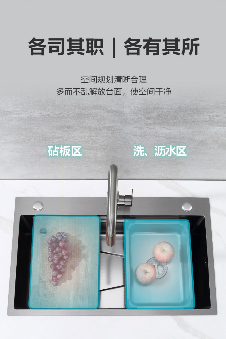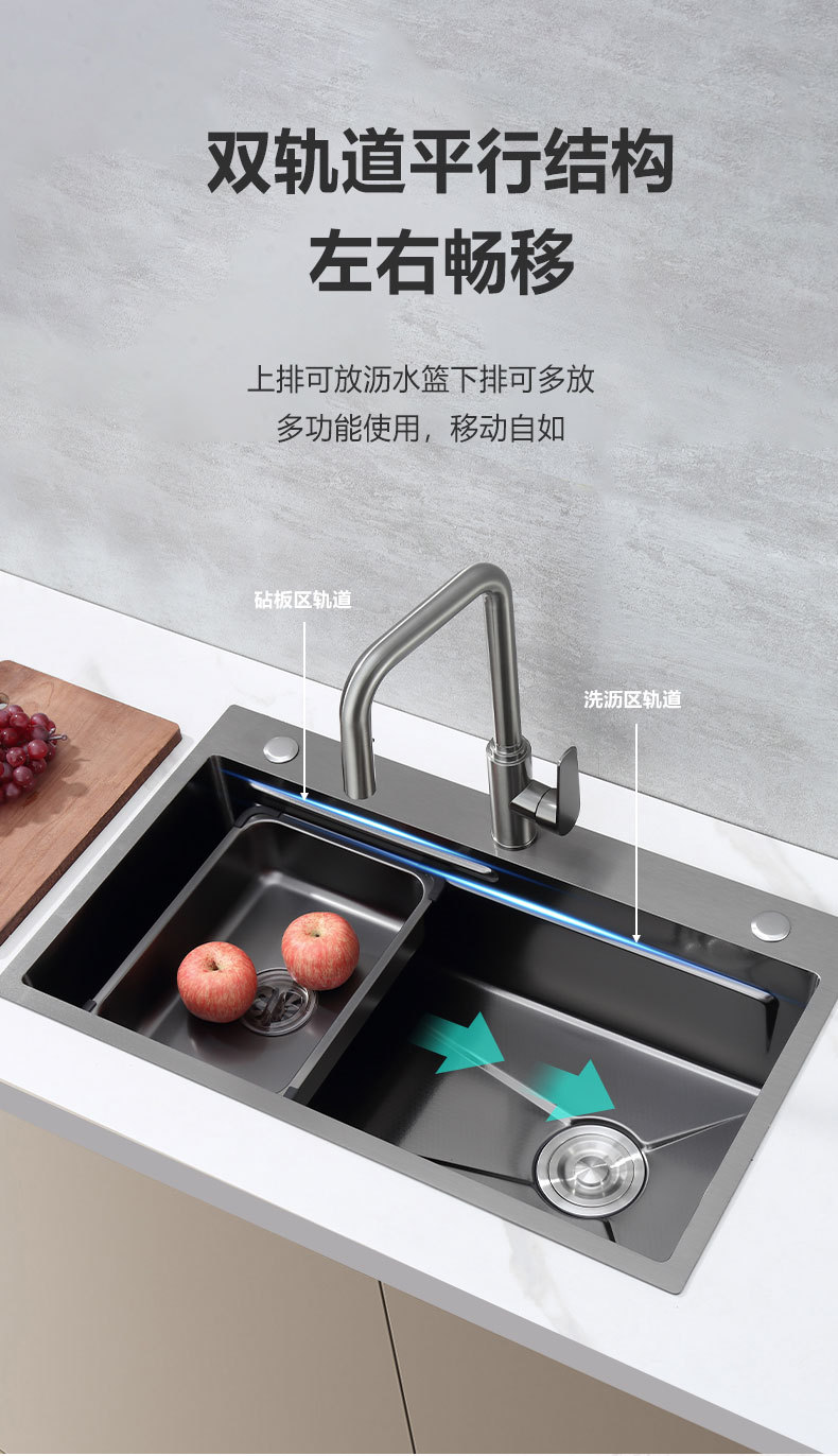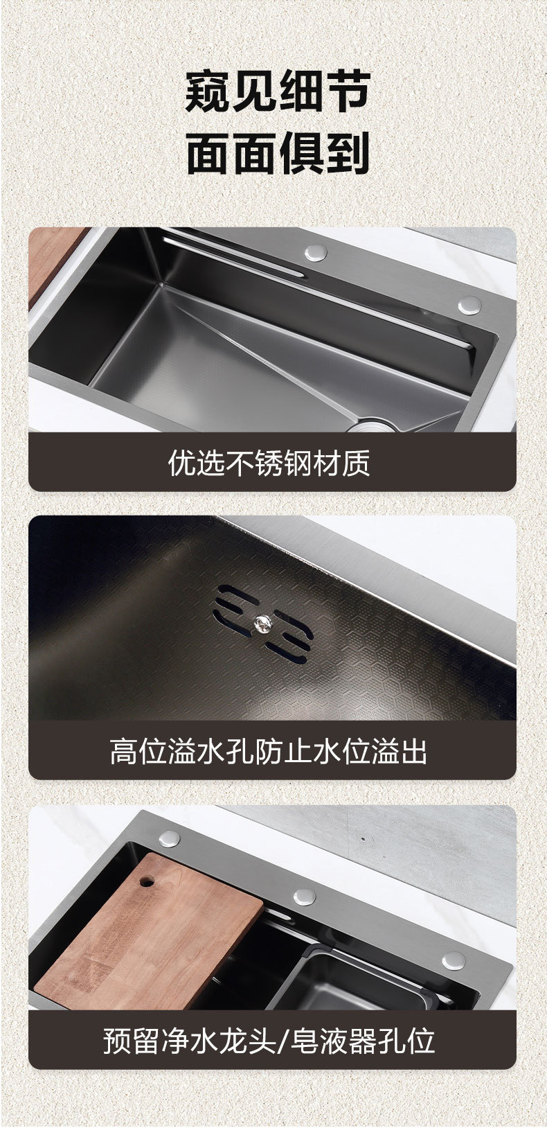 銃灰ナノ多機能水槽飛雨大単槽304ステンレス単槽皿洗い洗面器ゴミ箱付き