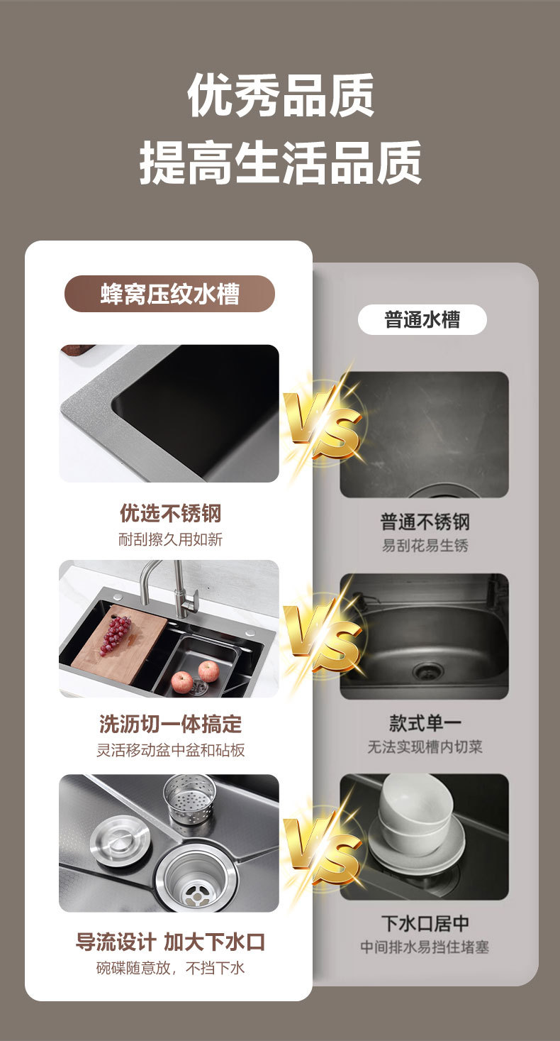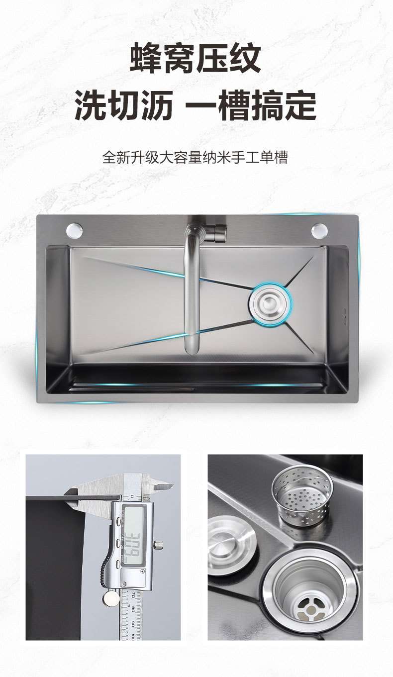 蜂窝纳米水槽大单槽加厚SUS304不锈钢家用厨房洗菜盆洗碗槽一体盆