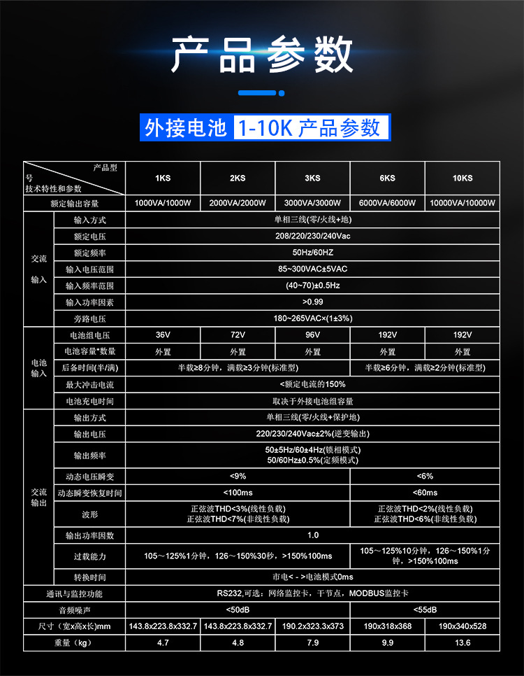 型号 1kva/1kw(外接电池),6kva/6kw(外接电池)w,10kva/10kw(外接电池)10,15kva/15kw(外接电池),20kva/20kw(外接电池)