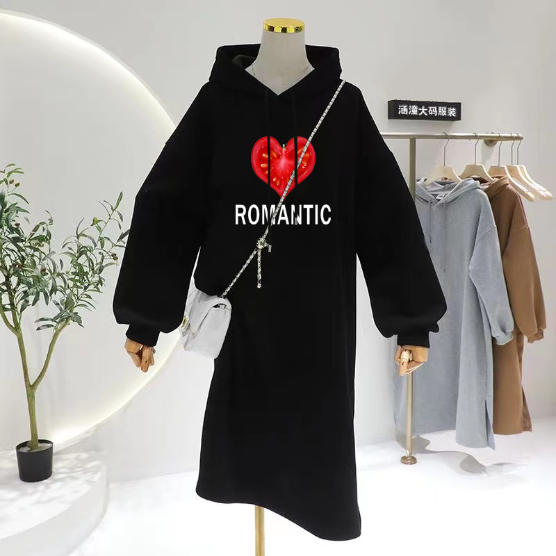 外贸休闲胖MM秋冬新款大码宽松连帽加绒保暖开叉中长款卫衣女长裙