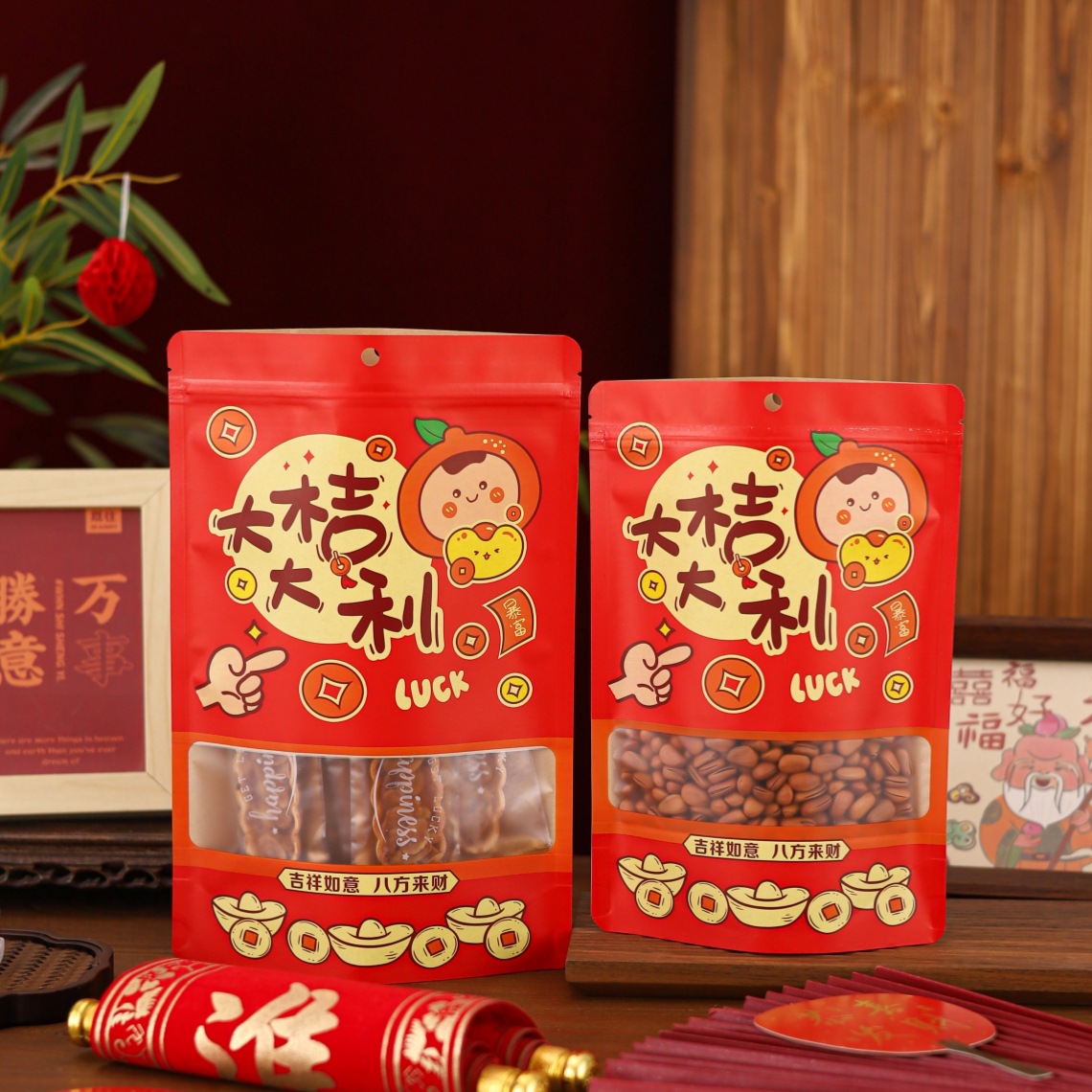 红色大吉大利牛皮纸年货袋红枣核桃零食喜庆坚果送礼品自封包装袋
