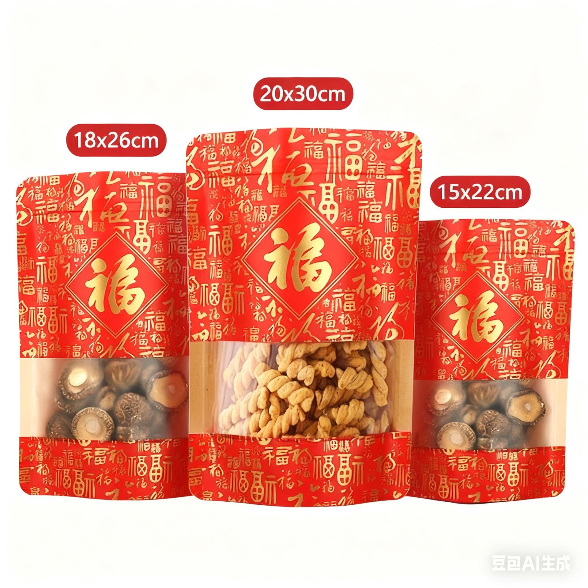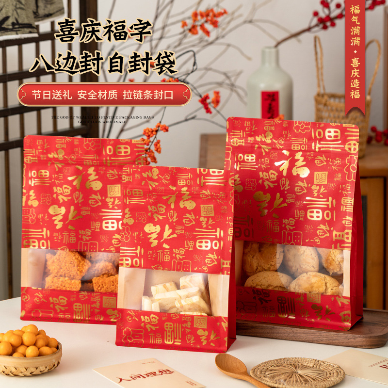 年货红色牛皮纸福字包装袋喜庆送礼品干坚果零食点心自立八边封袋
