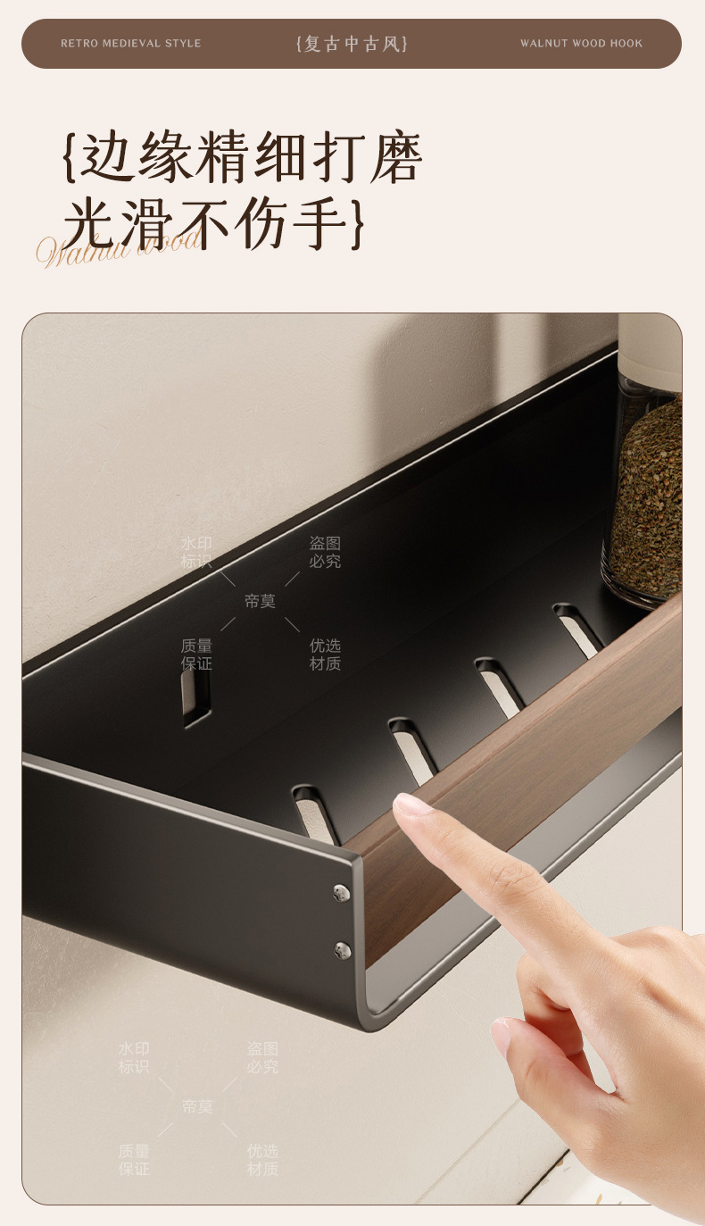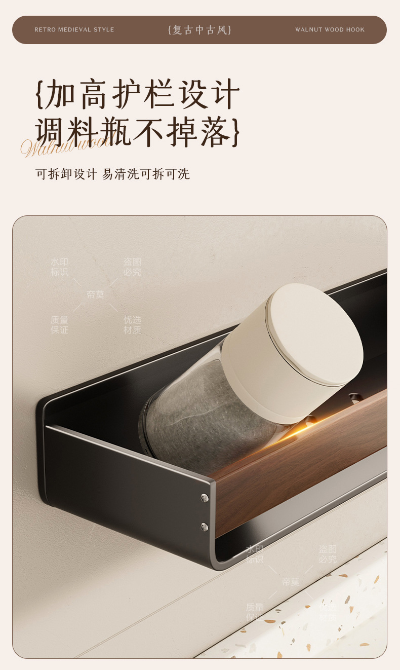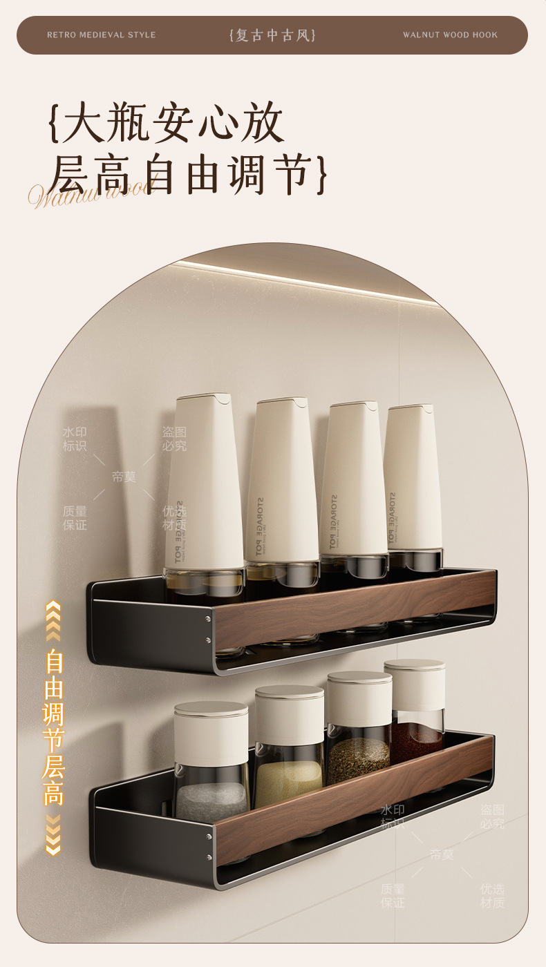 胡桃木纹厨房置物架调味品中古风免打孔壁挂式多功能收纳调味料架