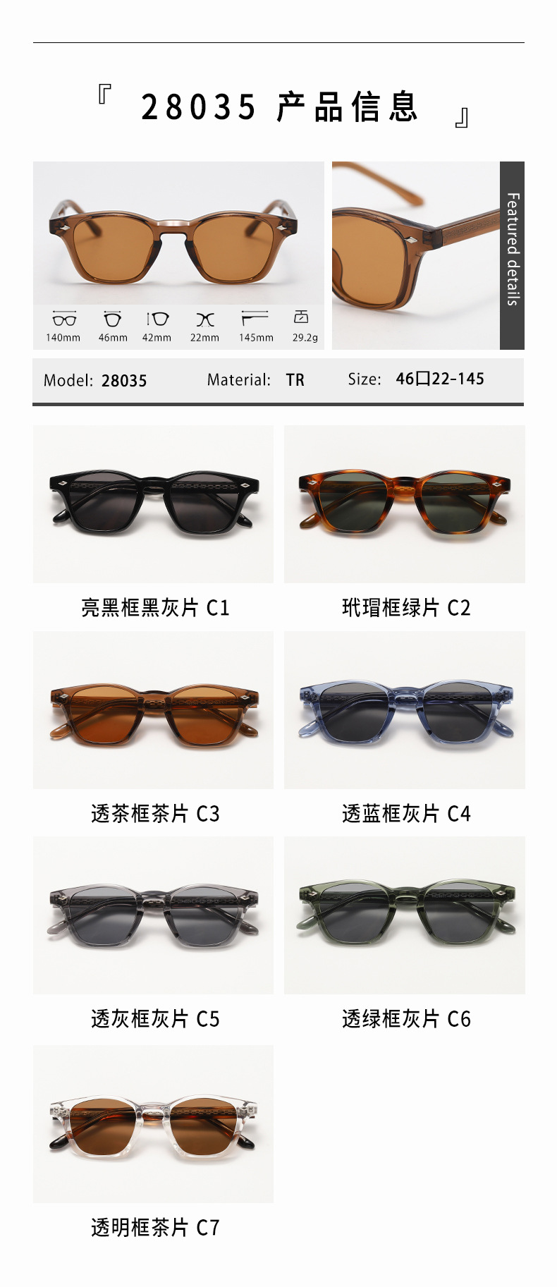 颜色 亮黑框黑灰片 C1,玳瑁框绿片 C2,透茶框茶片 C3,透蓝框灰片C4,透灰框灰片C5,透绿框灰片C6,透明框茶片C7