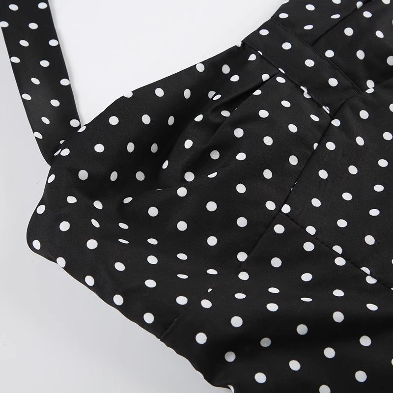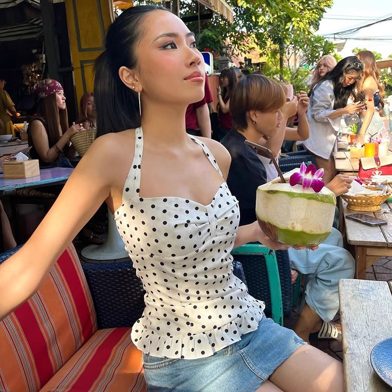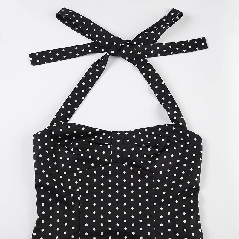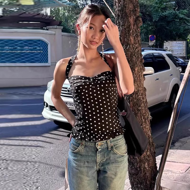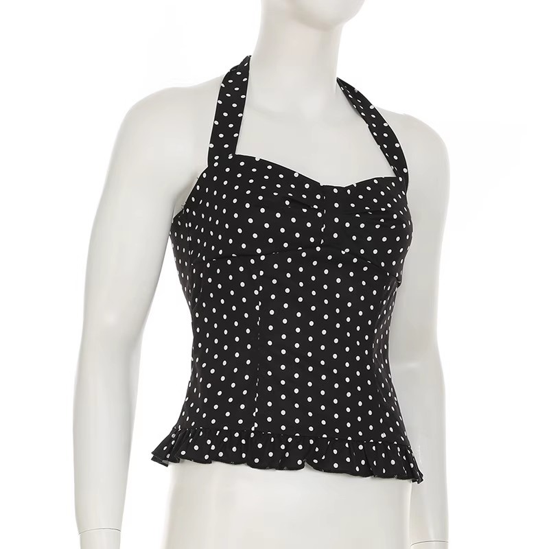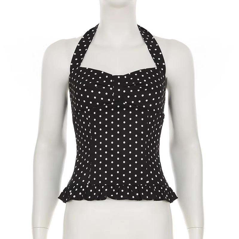 30572#女法式波点印花辣妹挂脖绑带吊带背心女纯欲公主风收腰上衣