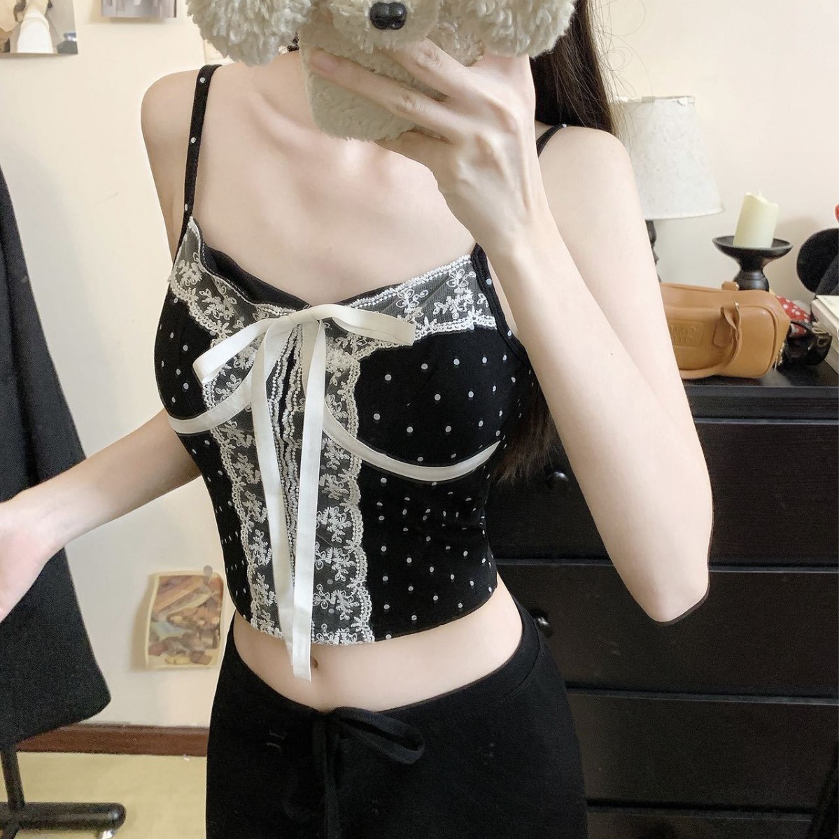 66023#人棉时尚蕾丝拼接波点印花美背吊带修身百搭背心打底上衣潮