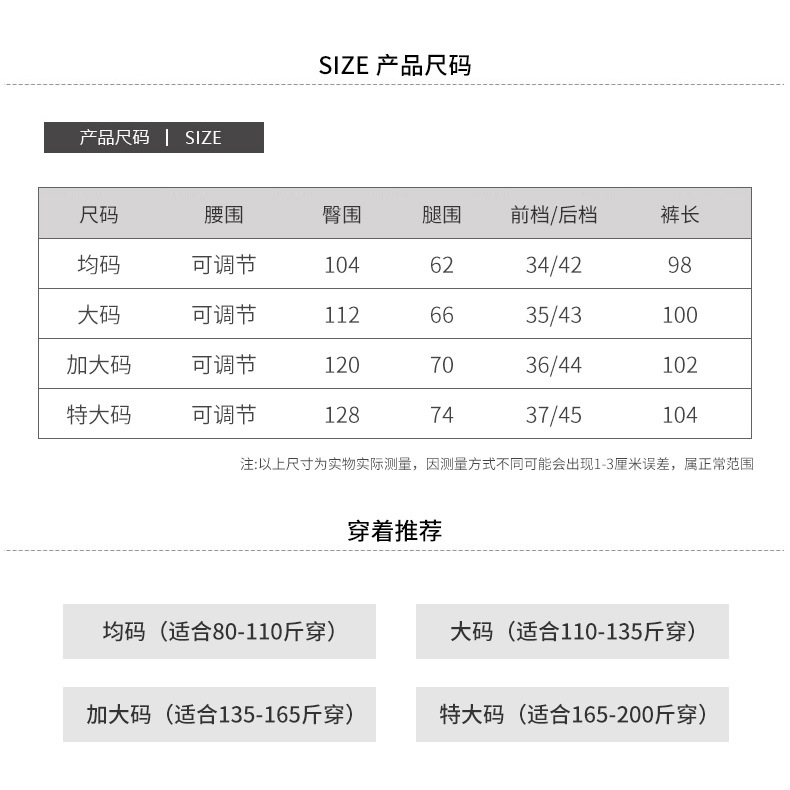尺码 均码(90-115斤),大码(115-135斤),加大码(135-165斤),特大码(165-200斤)