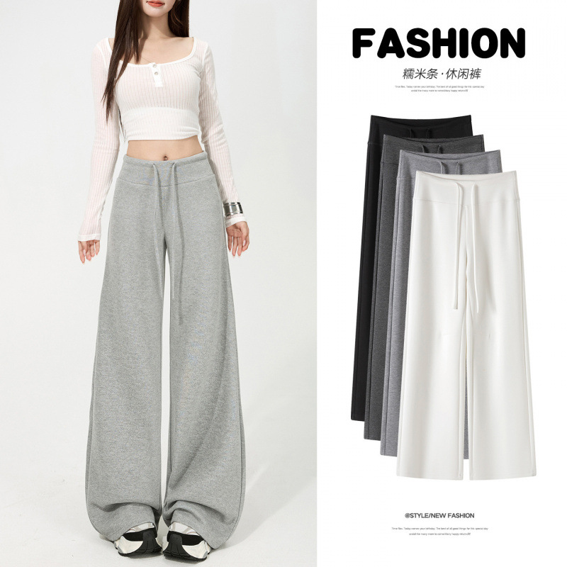 浅灰色阔腿休闲微喇卫裤女秋冬新款美式宽松高腰抽绳直筒运动裤子