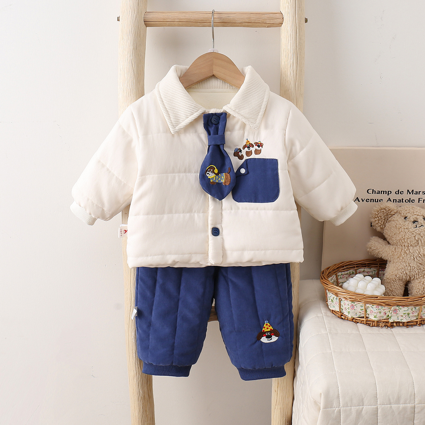 2025年冬季夹棉衣服两件套一岁男宝宝卡通保暖薄棉棉服分体套装
